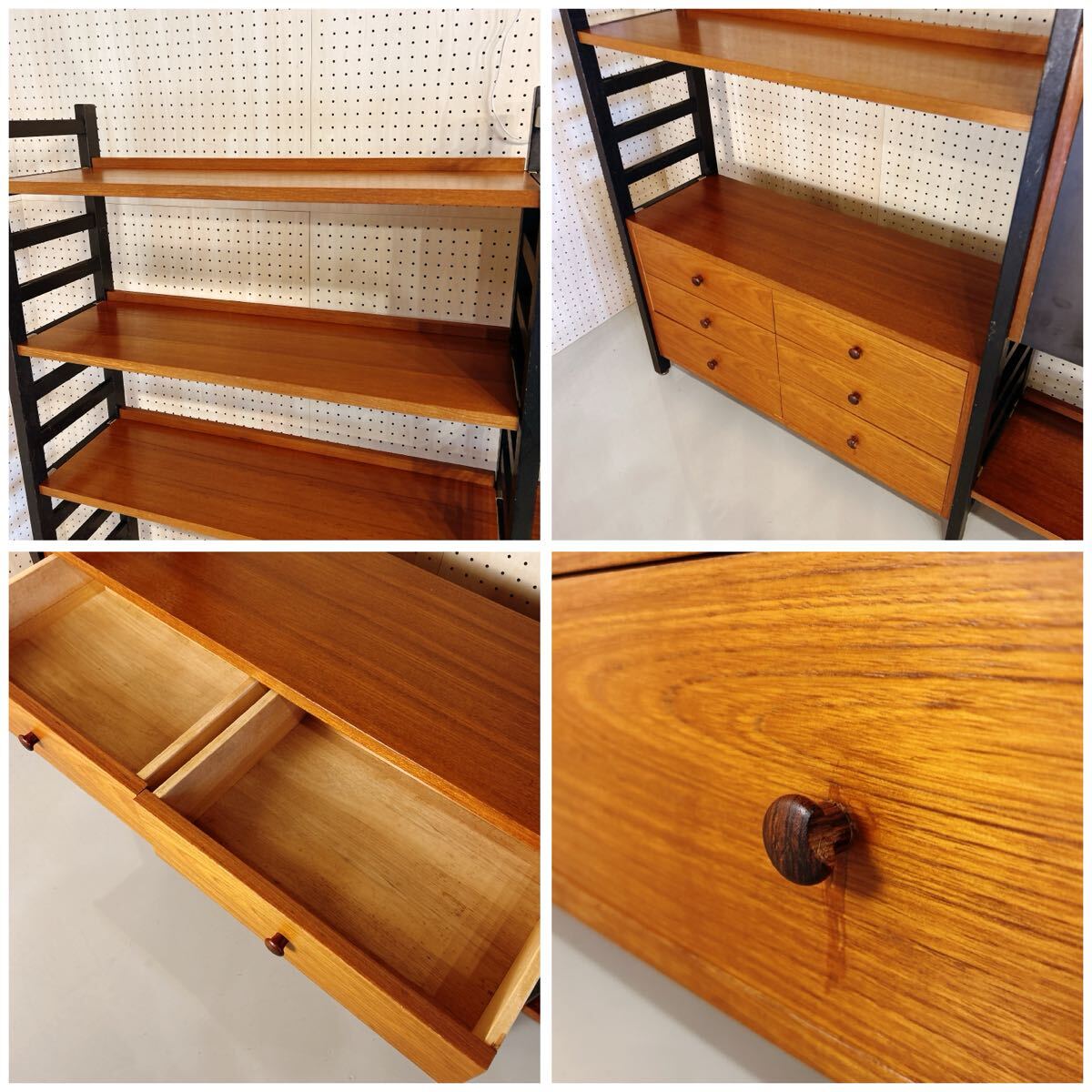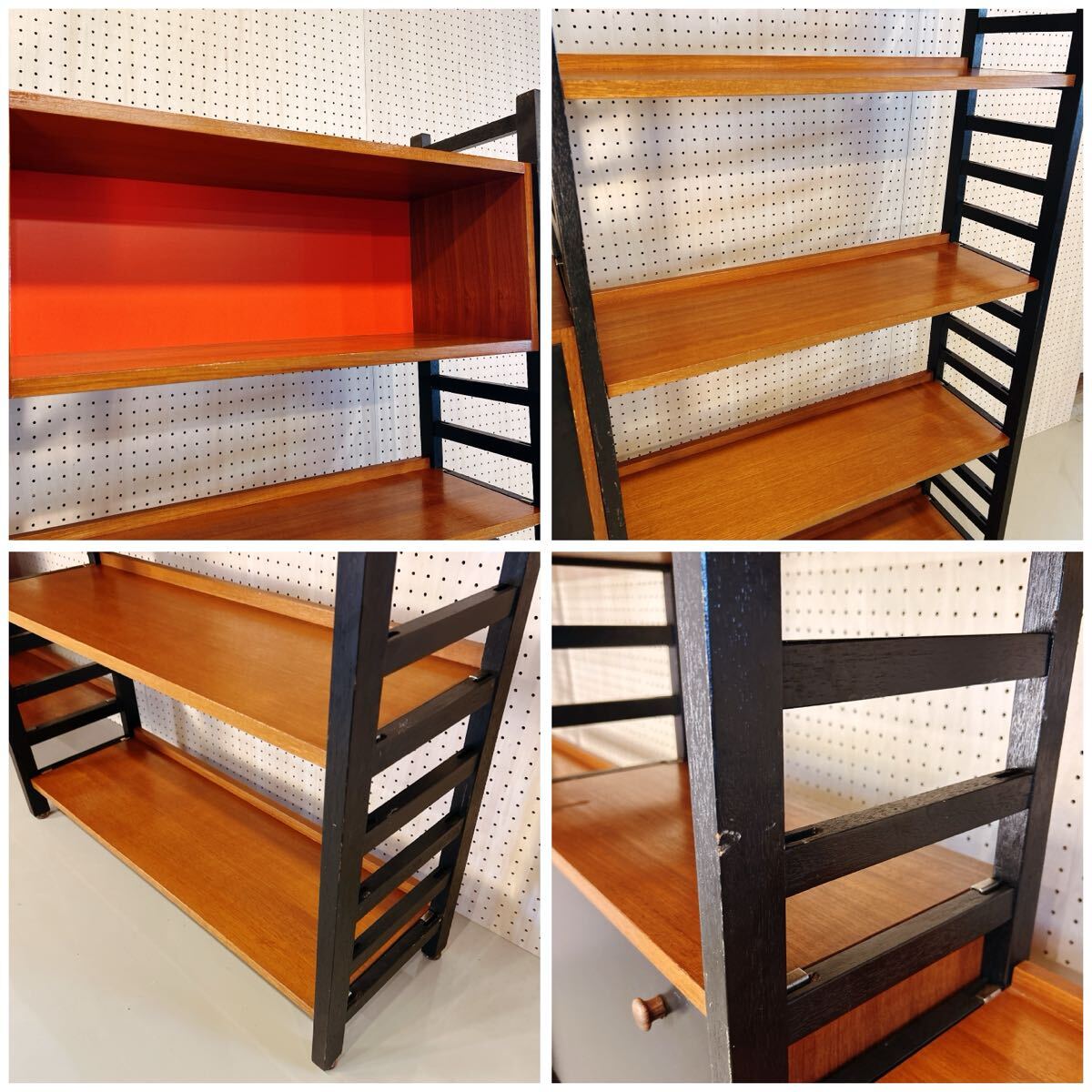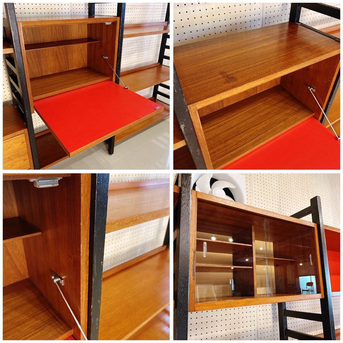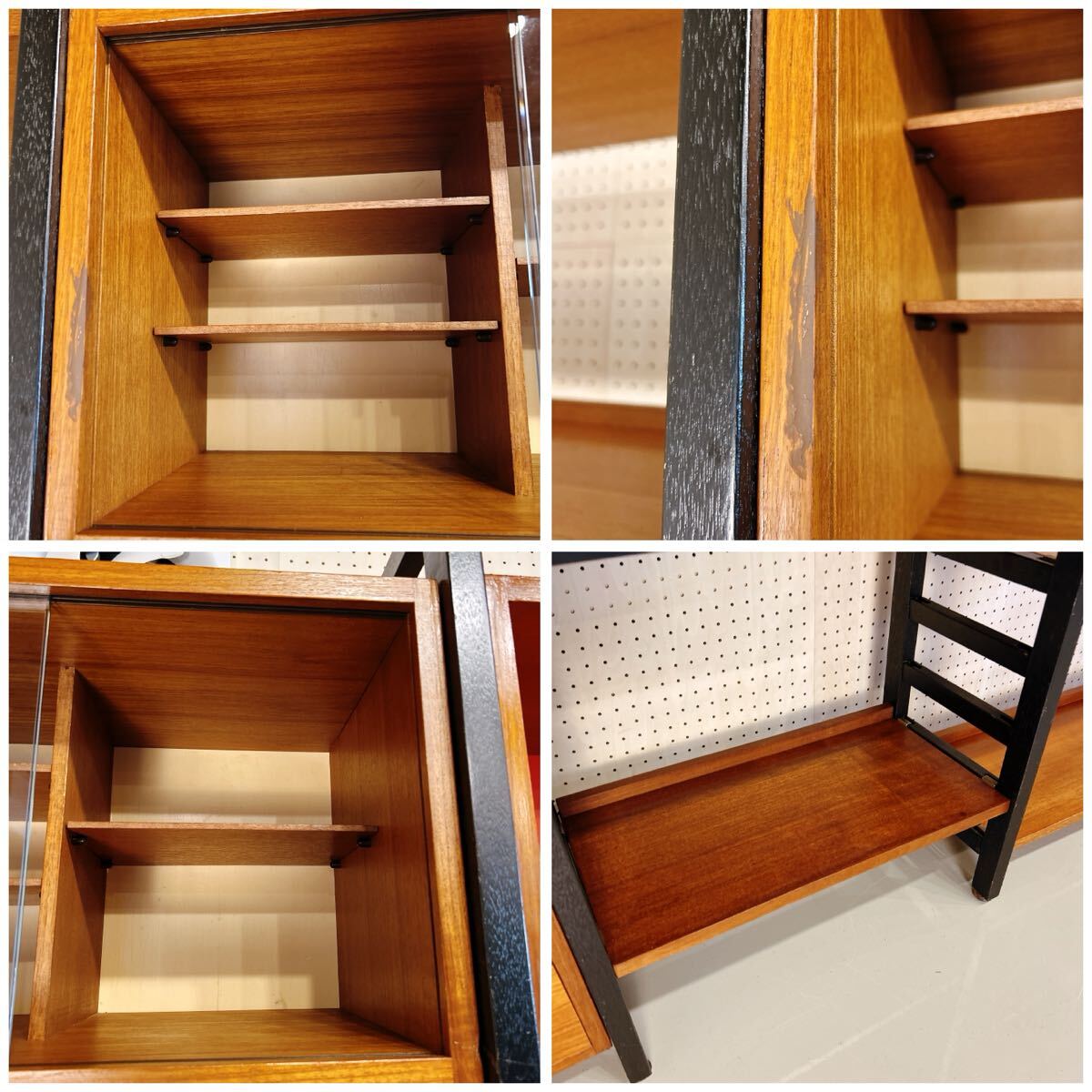 ハシゴ状になって高さを調整出来る無垢材支柱、チーク材突き板仕上げのオープルラック・前開きキャビネット・棚板・チェスト・ガラス棚の仕様です。