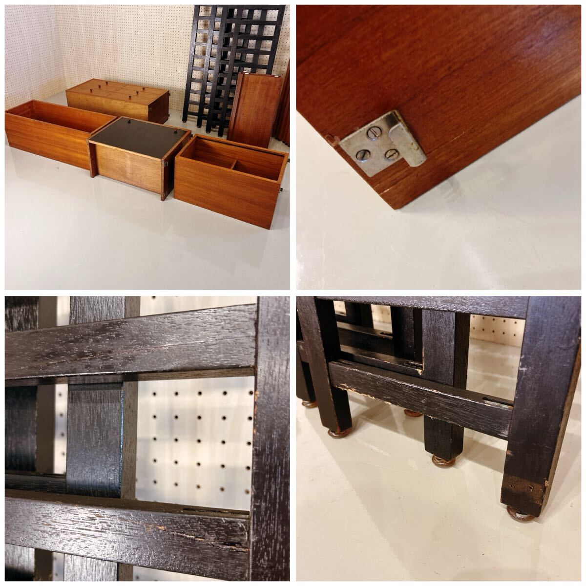 支柱にはキズや塗装の剥げ、金具を掛ける穴に傷や欠け、棚などは突き板の剥がれやパテによる補修跡があります。