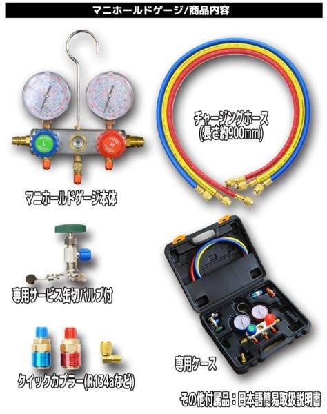 商品仕様 ・対応冷媒:R134a R12 R22 R502。 ・2バルブゲージ付マニホールド(取付用フック付)×1 |