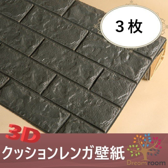 【3枚】高品質 3D クッション 壁紙シール ブラック/墨黒 レンガ調 糊付き はがせる クロス 70×77cm アンティーク 耐水 抗菌 落書き 傷防止