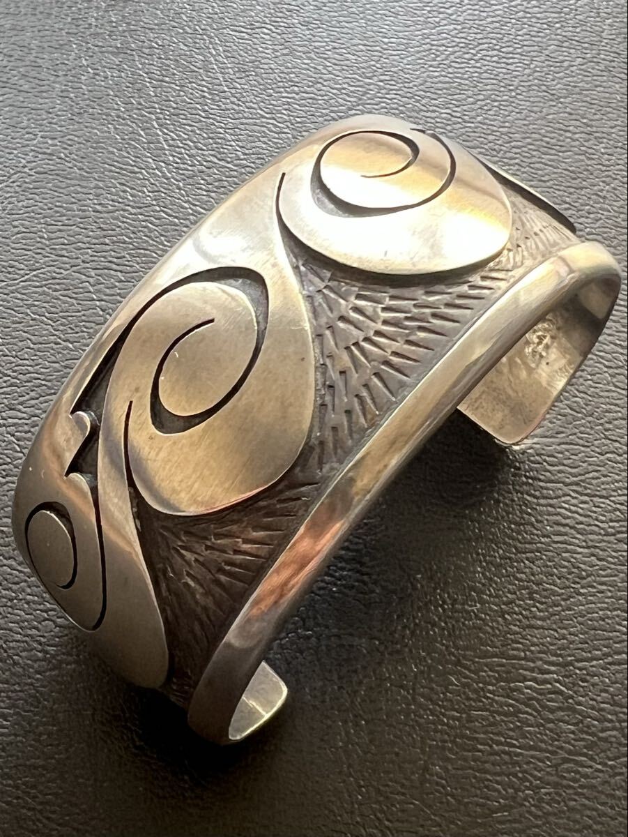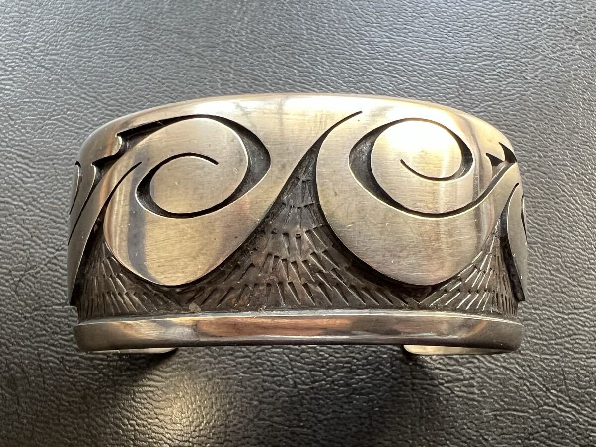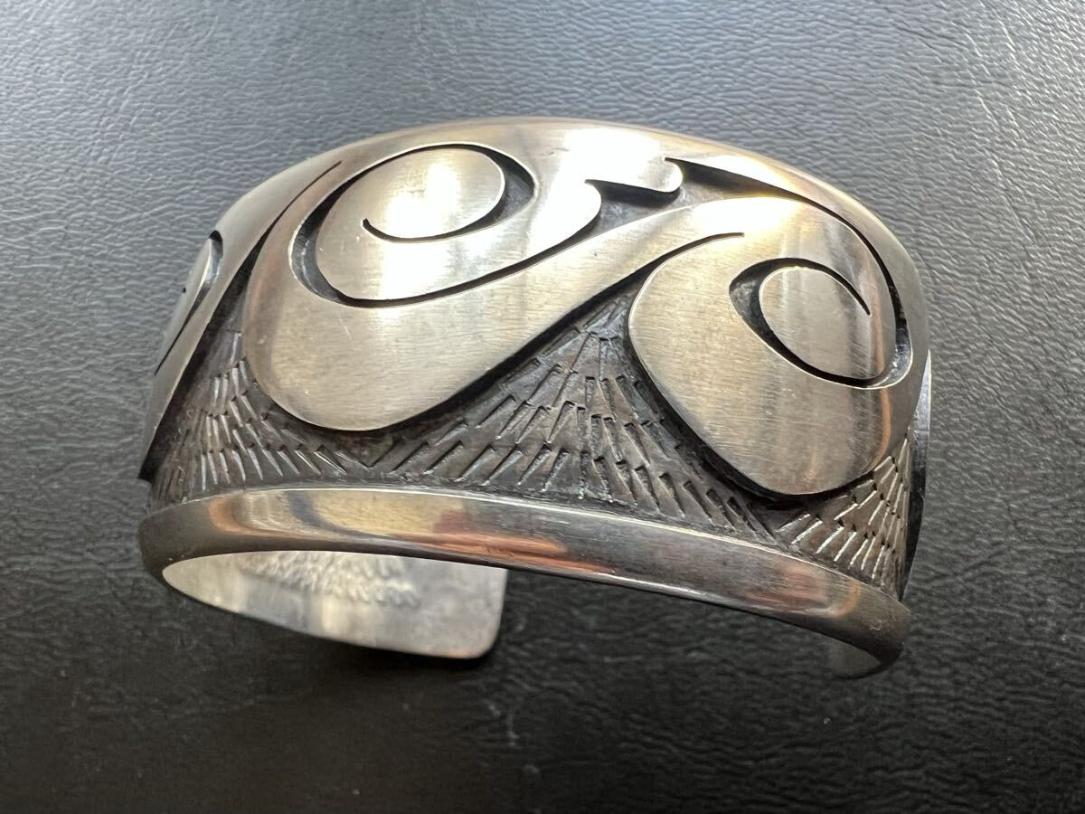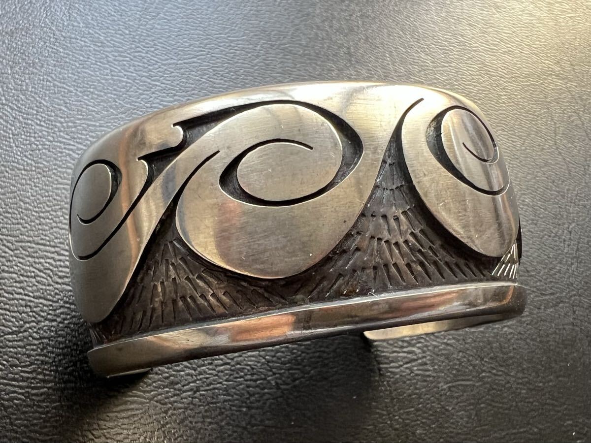 ホピ族の人間国宝 故『Robert Lomadapki/ロバート・ロマダプキ』により1980年に制作されたバングルになります。