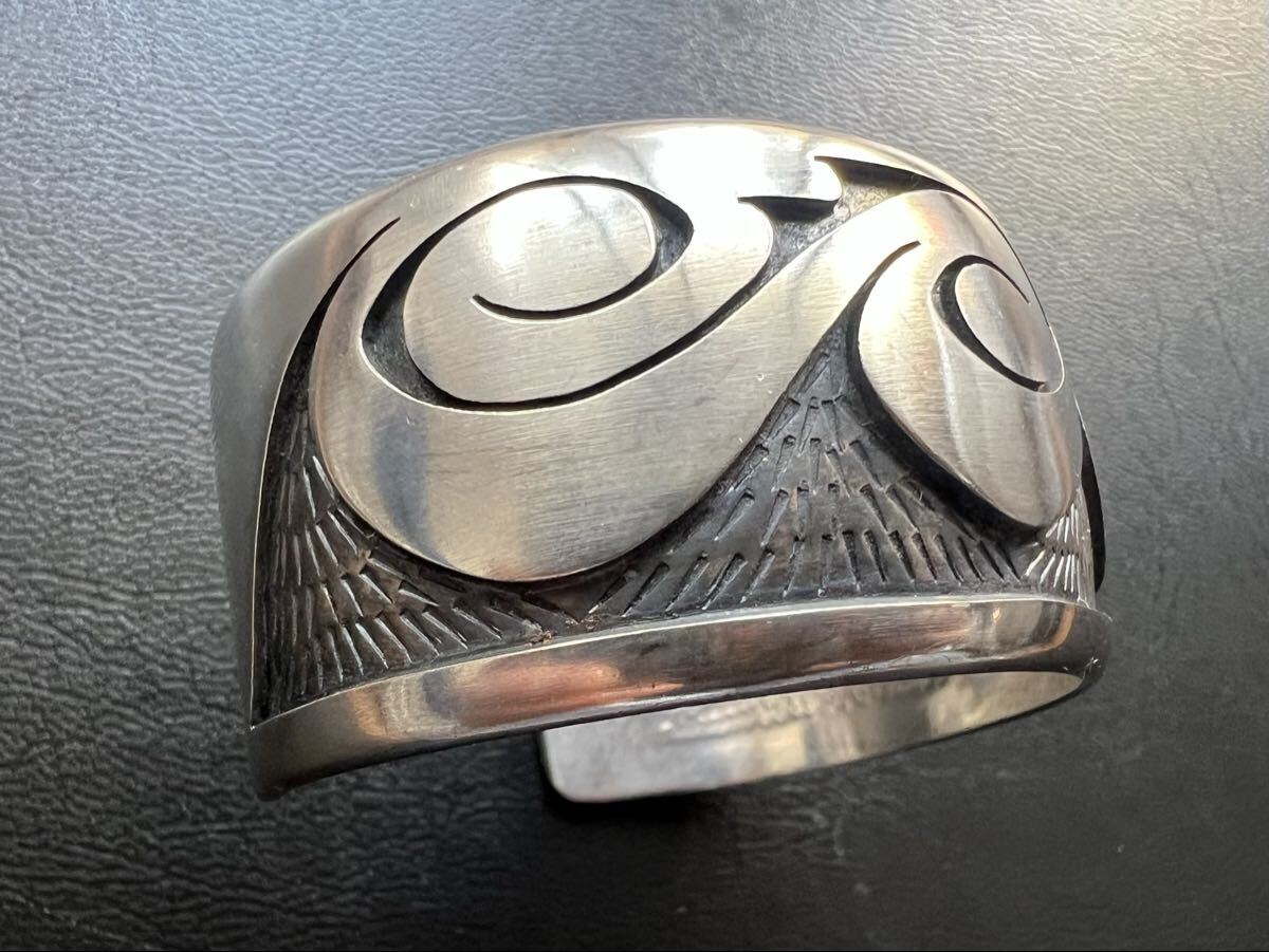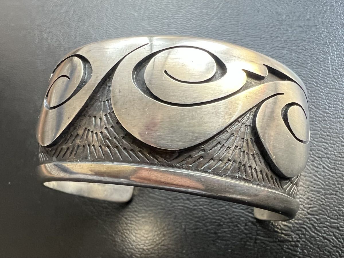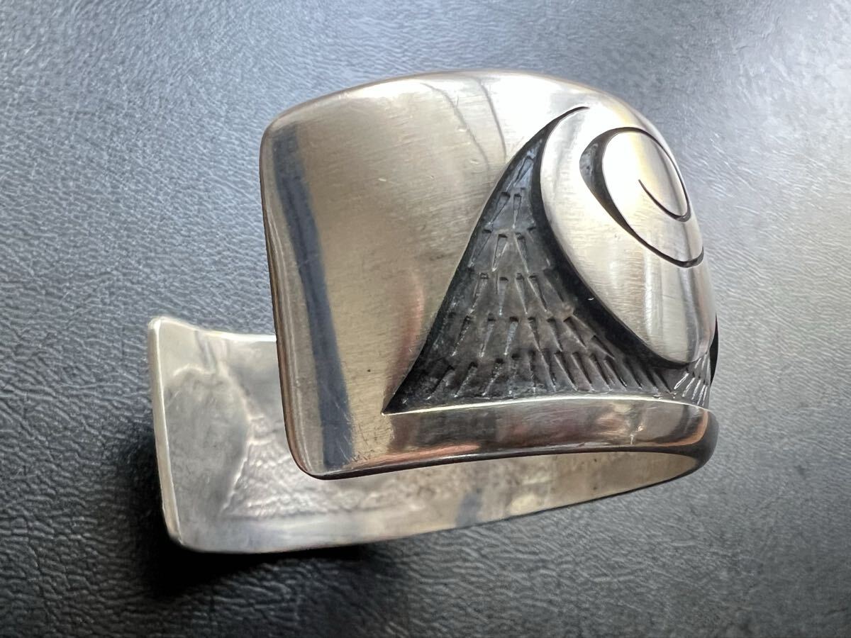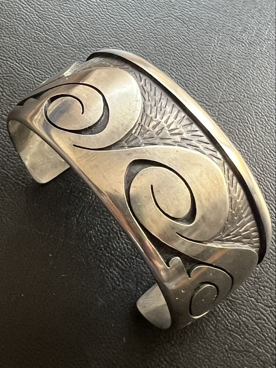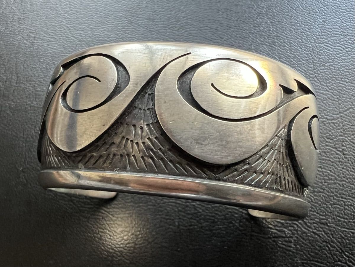 ホピ族の人間国宝 故『Robert Lomadapki/ロバート・ロマダプキ』により1980年に制作されたバングルになります。