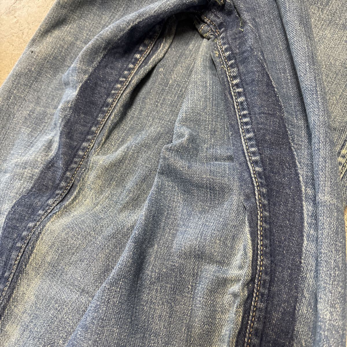 ●サイズ:12 ●ウエスト30cm股下71cm総丈100cmくらい。 ●およそ60年代後半から70年代の物と思います。 ●画像のように内股部分に色残りがあるので、 ●当時購入された方がより細くする為に内側に折り込んで縫った跡だと思います。 ●ひび割れ欠損ありますが、 ●大体全て無くなってしまっている皮パッチ残っています。 ●探していた方、この機会に是非どうぞ。 |