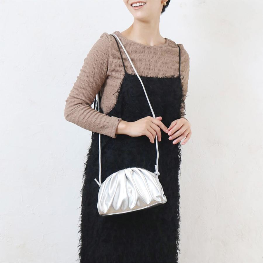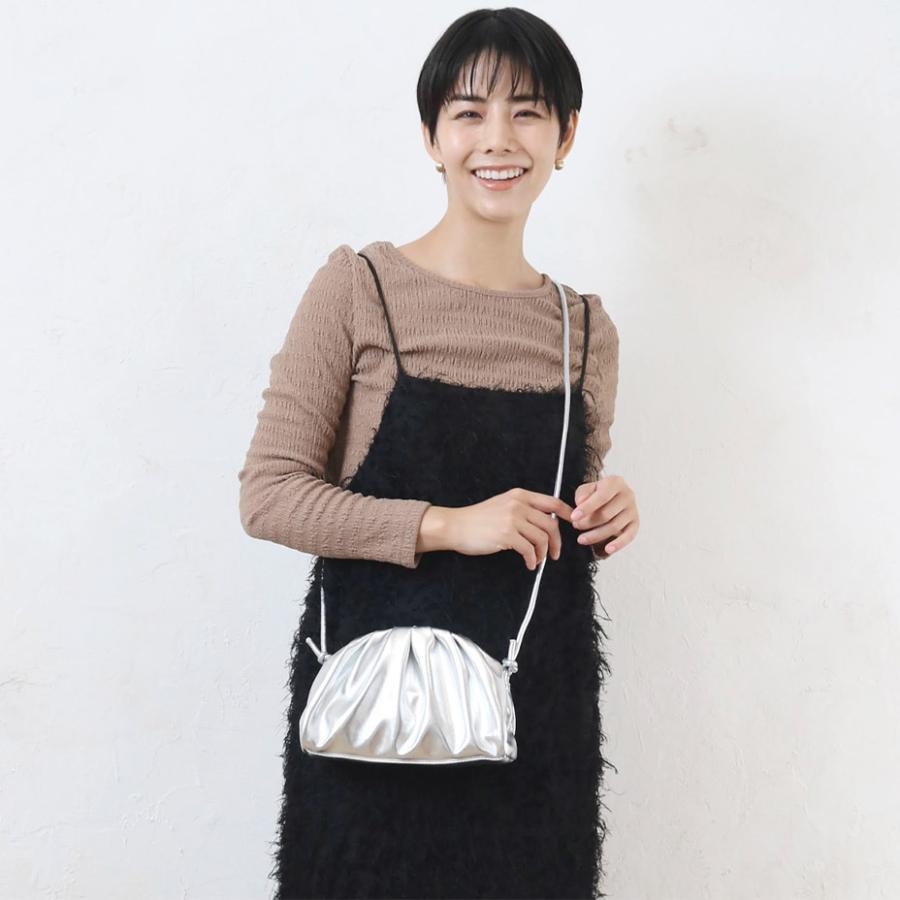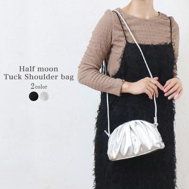 トレンド感溢れるタックディティールがポイントの合皮半月タックショルダー。