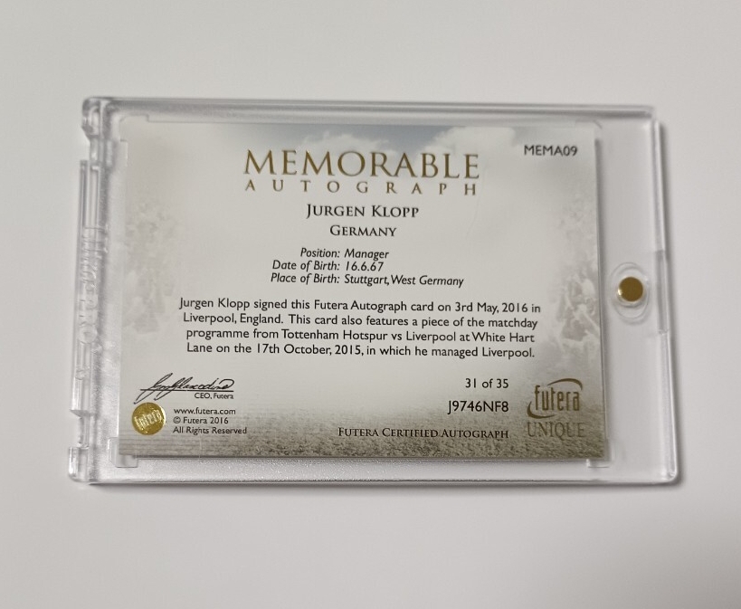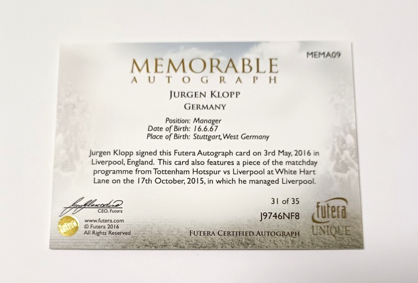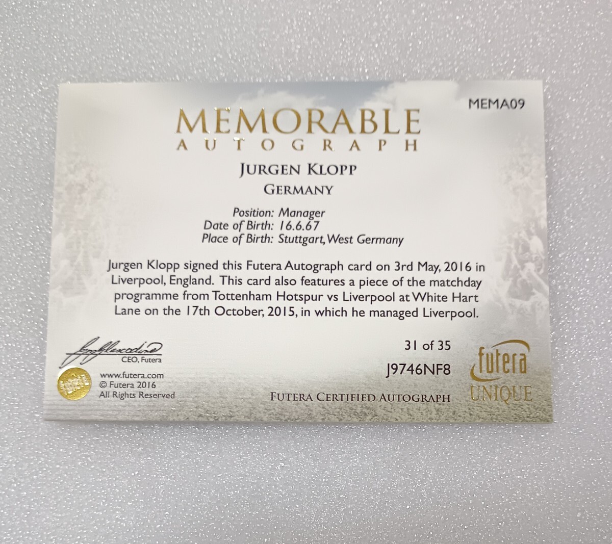 ご覧いただき誠にありがとうございます。現、大宮アルディージャ レッドブル 陣営のユルゲン・クロップ氏直筆サインオンカードです。シリアル31/35です。