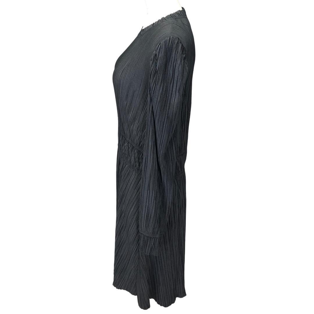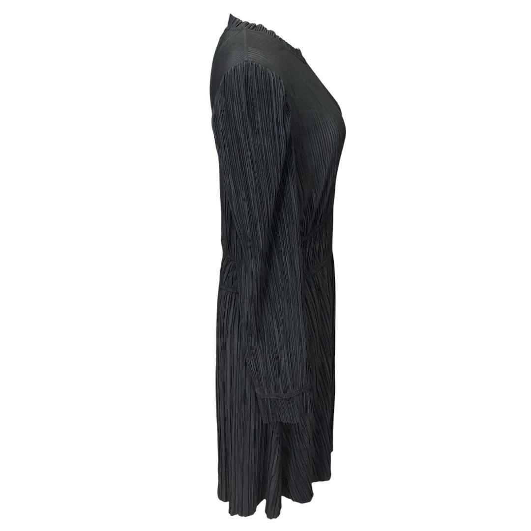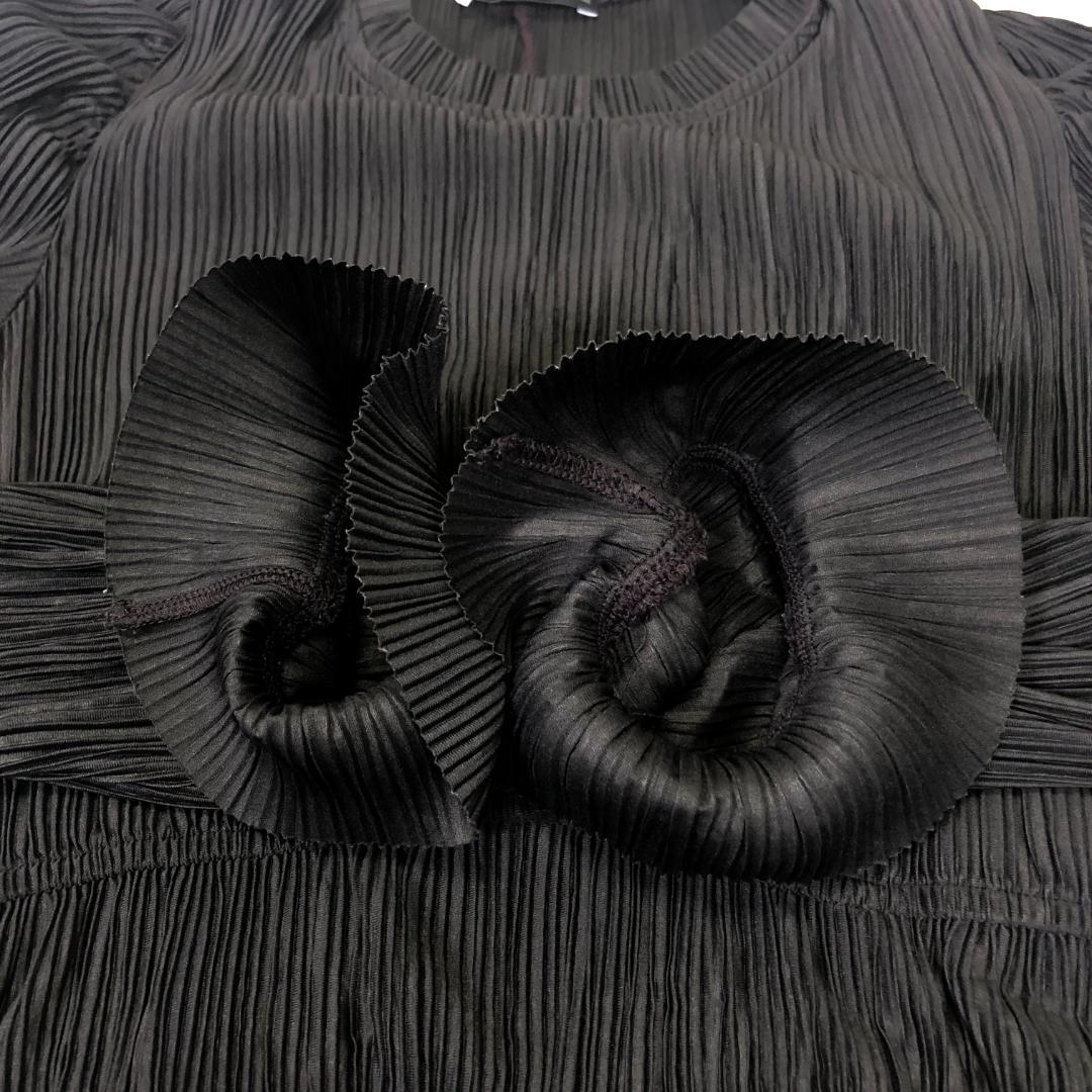 全体に細かなプリーツ加工が施された、エレガントなブラックの長袖ワンピースです。ウエスト部分にはゴムシャーリングが入っており、スタイルアップ効果も期待できます。少し透け感があります。身長160cm着用で膝丈です。ストレッチが効いています。