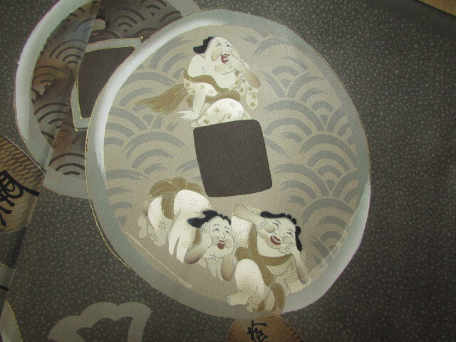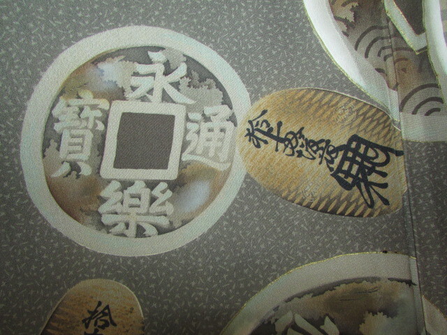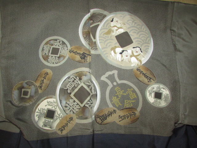 古い時代の珍しい・・大判・古銭・お福さんなど・・縁起の良い模様の羽織です。