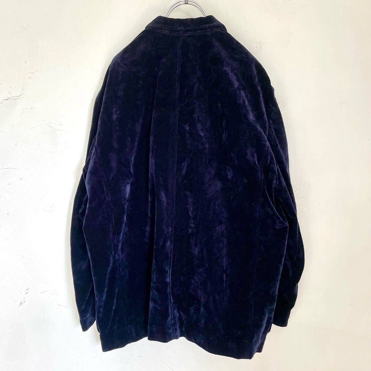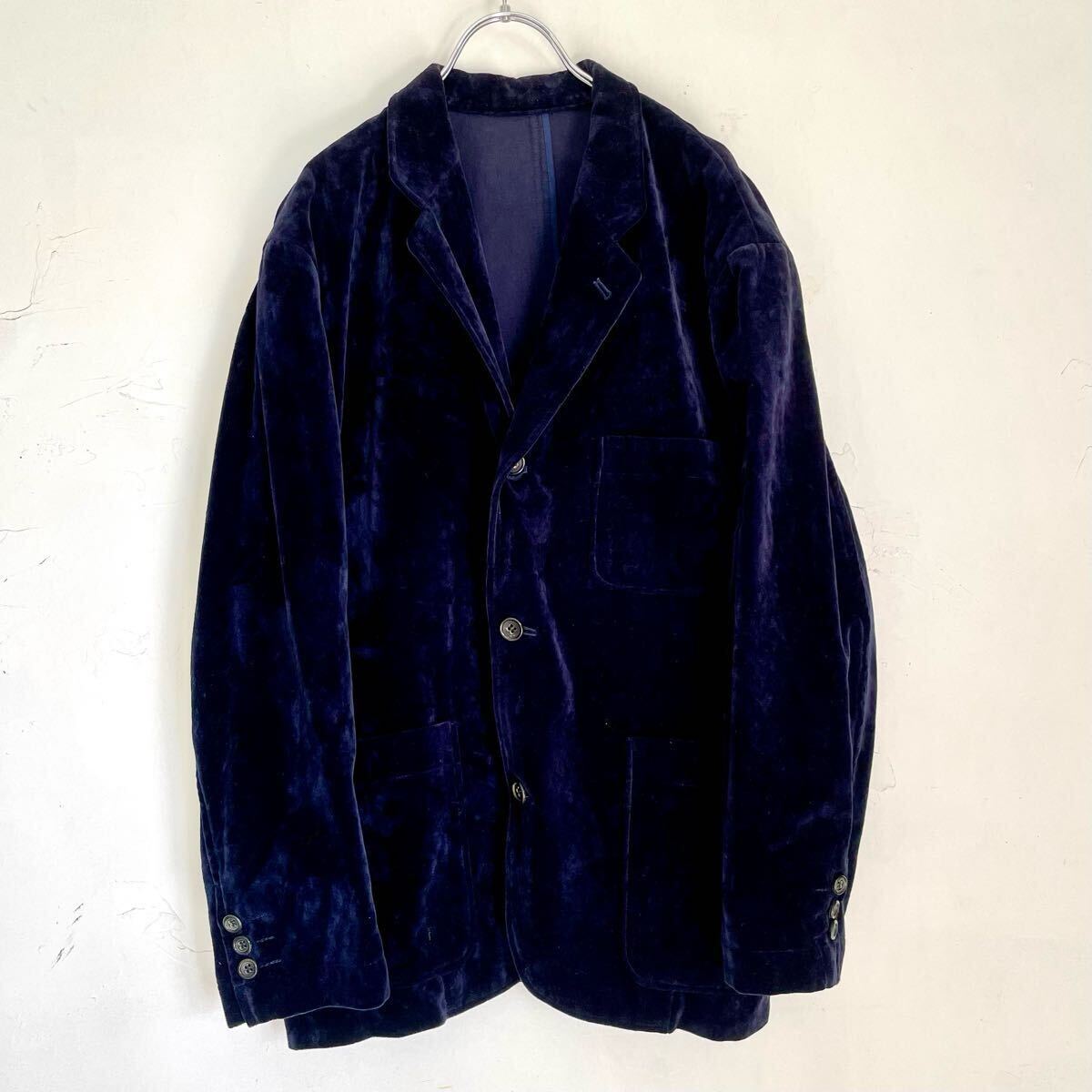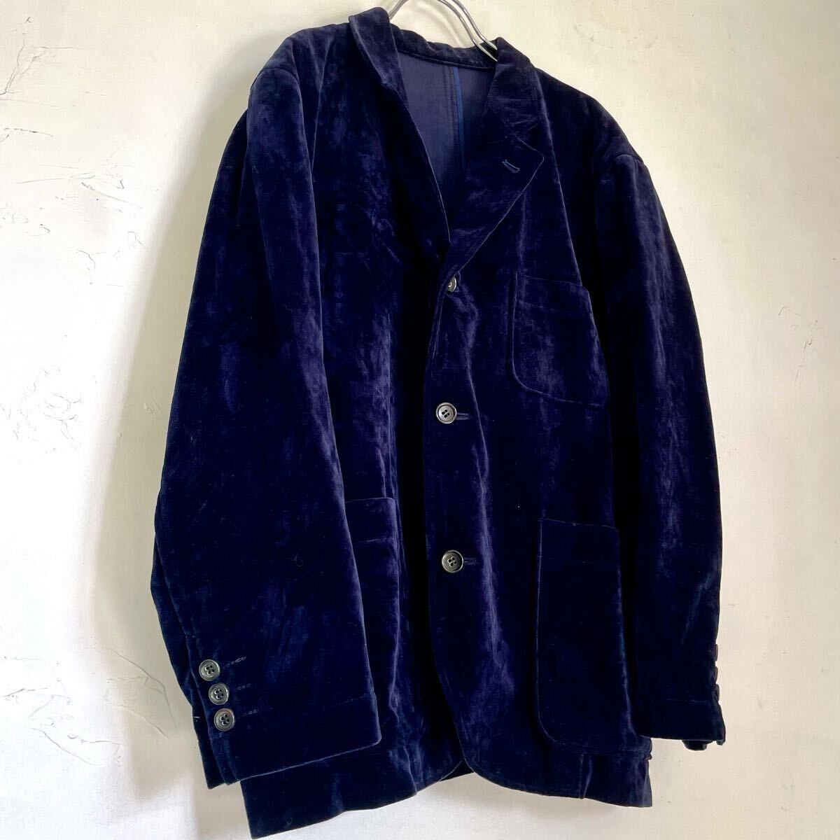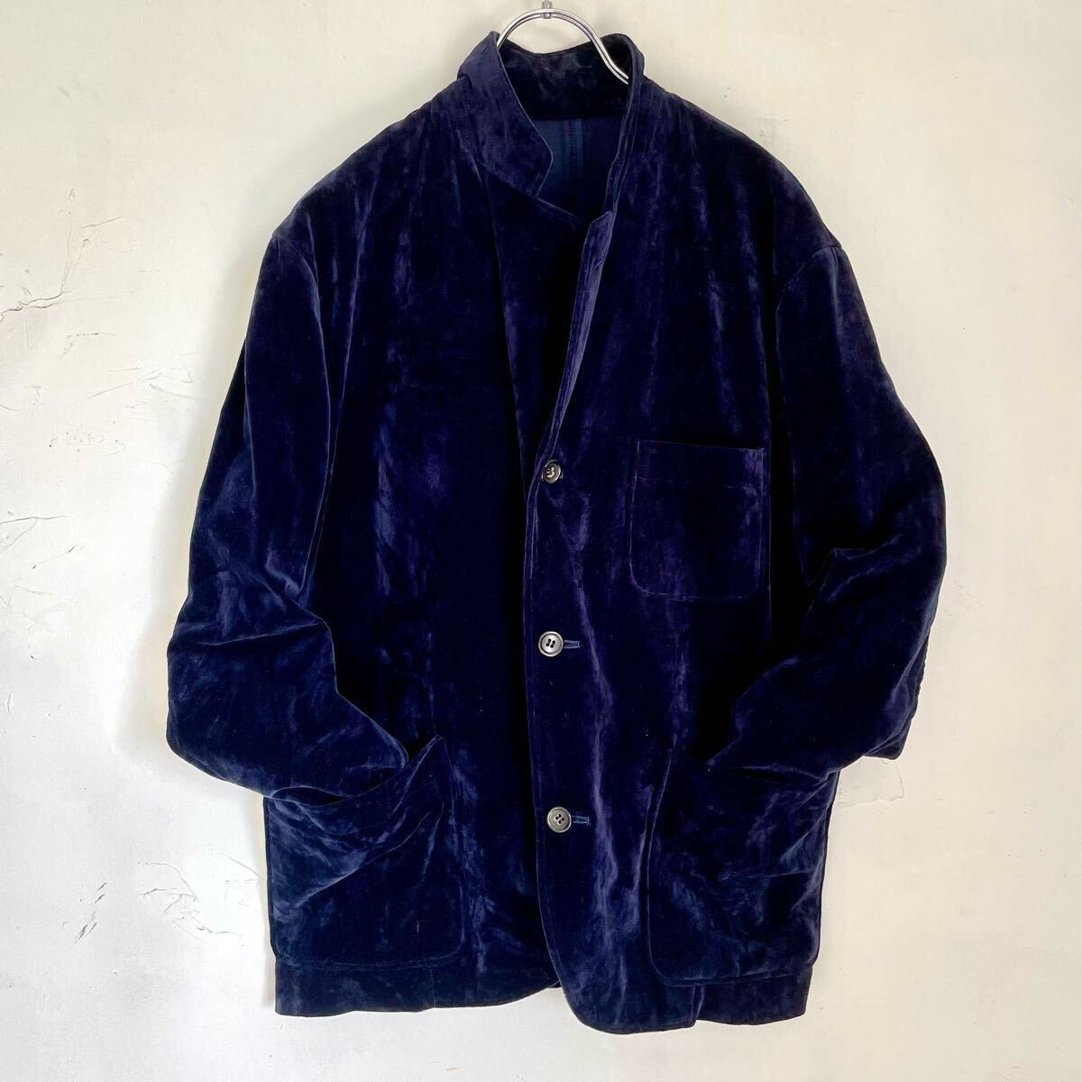 コットン100% ベロア生地アンコンジャケットブレザーになります。紺色 ネイビー。メンズMサイズ。肩のおちるサイズ感フォルムの良い品です。男女問わずざっくりと着て頂けるかと思います。国産 日本製。