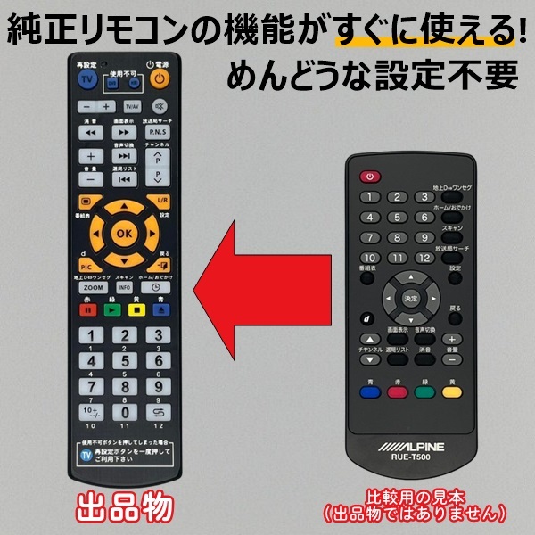 【商品名】 ALPINE RUE-T500 代替リモコン 【対応機種】 TUE-T500 用 画像1枚目右側のリモコンが付属する機種に使用出来ます。 上記機種以外については、質問欄よりメーカーと型番をご連絡頂ければ、対応品のご案内をしております。 【商品について】 左側の代替リモコンが出品物になります。右側のリモコンは見本画像です。 タイトル機種のリモコン信号を入力した、設定不要で使える純正品と同等の代替リモコンです。 乾電池は付属しません。別途ご用意下さい。(単4乾電池×2本) 【商品サイズ】 縦18.5cm×横5cm×高さ2.35cm 【発送について】送料無料 迅速発送を心掛けております。土日祝日はお時間を頂く場合ございます。 ポスト投函配達となり、日時指定は出来ません。 | ||