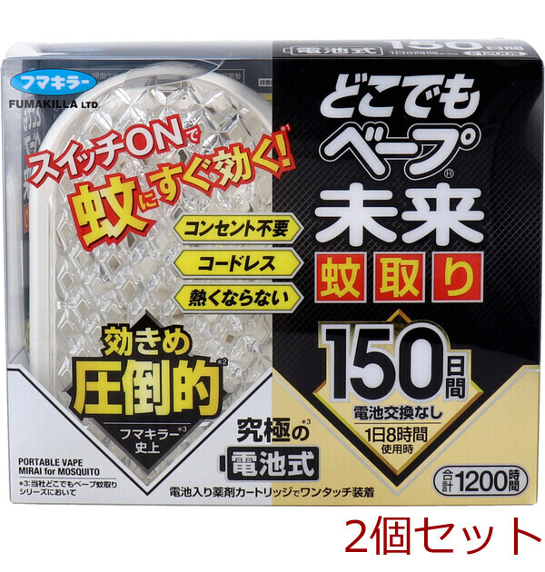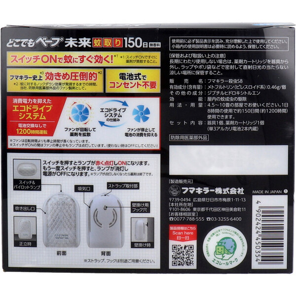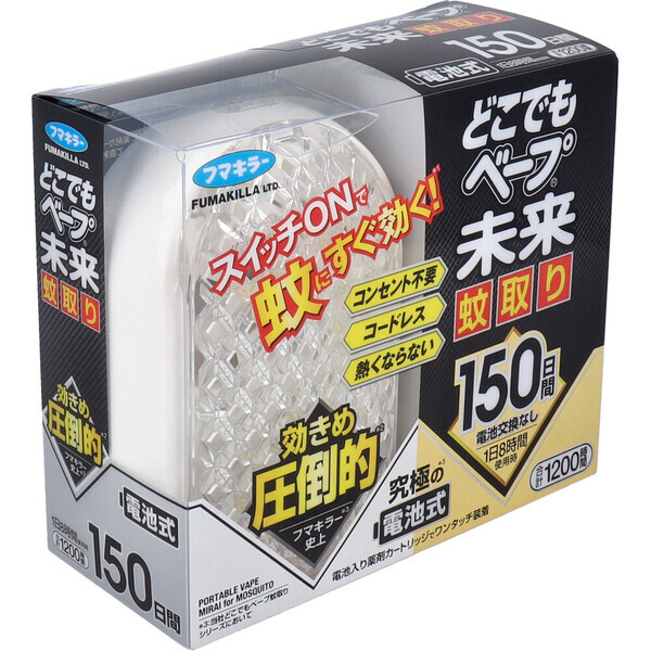 スイッチONで蚊にすぐ効く! 効きめ圧倒的! ※※フマキラー社どこでもベープ蚊取りシリーズにおいて ・電池式でコンセント不要。 ・コードレス。 ・熱くならない。 ・150日間※電池交換なし! ※1日8時間使用時 個装サイズ:150X125X65mm 個装重量:約234g 内容量:器具1個、薬剤カートリッジ1個(単3アルカリ電池2本内臓) 製造国:日本 【発売元:フマキラー株式会社】 【防除用医薬部外品】 販売名:フマキラー殺虫 S8 【成分】 ★有効成分 メトフルトリン(ピレスロイド系):0.46g/個 ★その他の成分 ジブチルヒドロキシトルエン 【効能】 屋内の蚊成虫の駆除 【用法・用量】 ・4.5~10畳の部屋でお使いください。 ・1日8時間の使用で約150日間(約1200時間)使用できます。 【保管および取扱い上の注意】 ・使用前に必ず製品表示を読み、充分理解した上で使用してください。 ・小箱内の使用説明書は必要時に読めるよう、保管してください。 ・長期にわたり使用しない場合は、薬剤カートリッジを器具から外し、ラップやポリ袋などで密封して直射日光の当たらない涼しい場所に保管すること。 注意事項 ※予告なく成分・パッケージが変更になることがございます。 予めご了承ください。 *予告なく成分・パッケージが変更になることがございます。予めご了承ください *ダンボールを使用して発送する場合には、入数以下の個数の場合、 中古ダンボールを使用する場合があり、ご注文の商品とは異なるダンボールになる場合があります。 あらかじめ、ご了承ください。 |