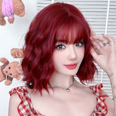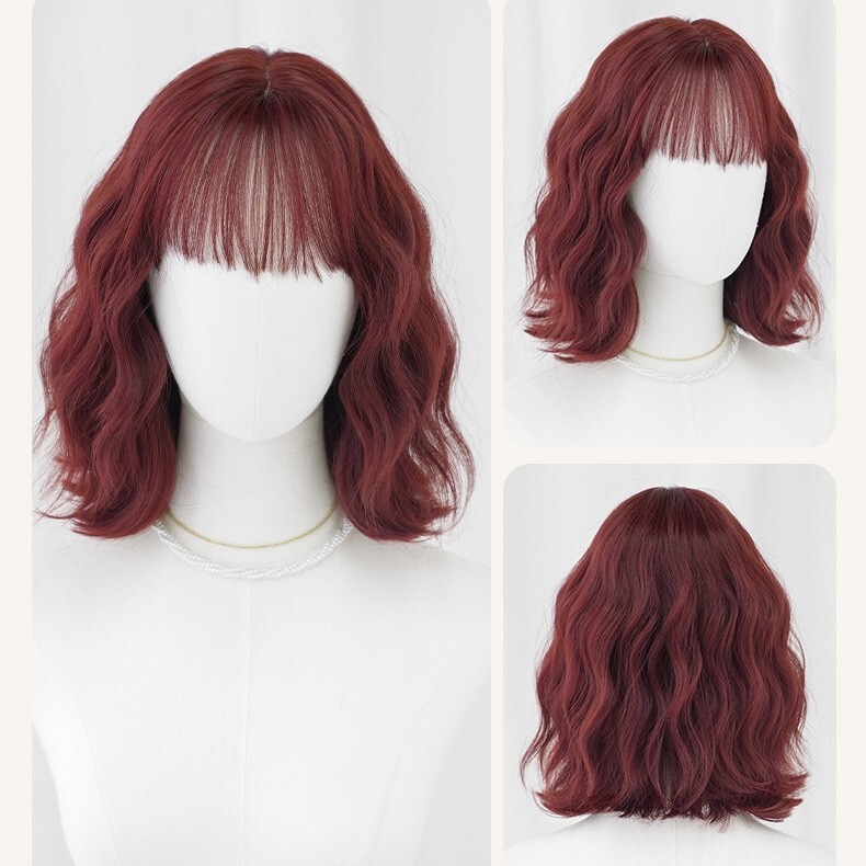 ボルドーレッド ミディアムウィッグ ウェーブ 前髪 耐熱 コスプレ 日常用