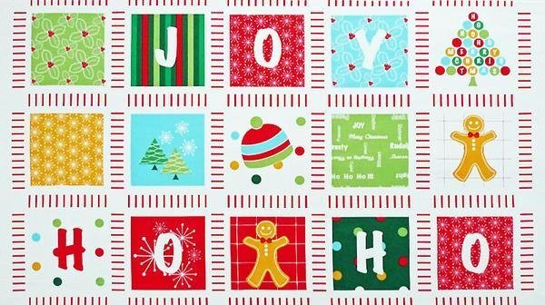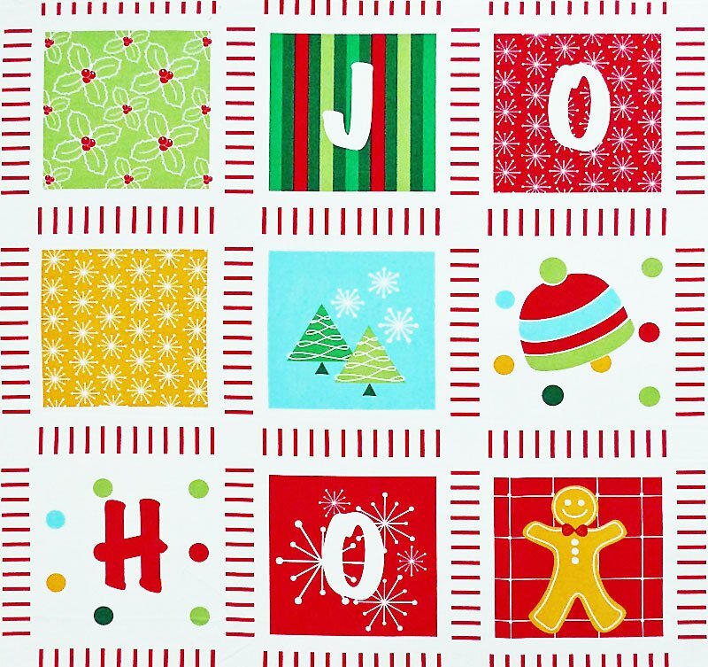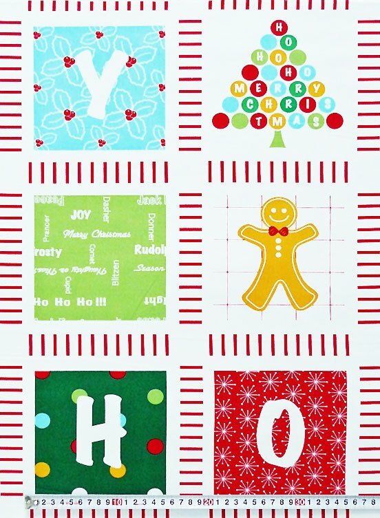 各パネルは明るい色使いで"J"、"O"、"Y"、"H"、"O"と言う文字やジンジャークッキー、クリスマスツリーなどを描いています。