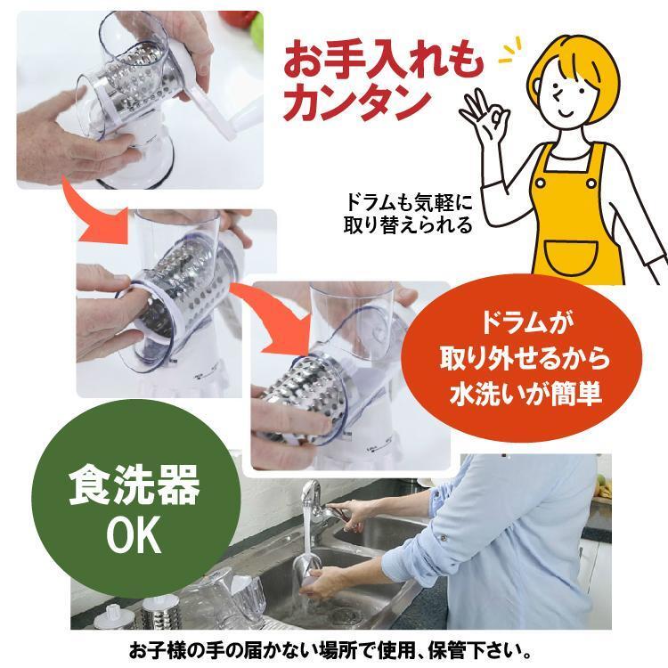 使い方は簡単、ステンレスドラムを付けてハンドルを回すだけ。3つのドラムを付替えれば、3通りの食材のカットが可能です。