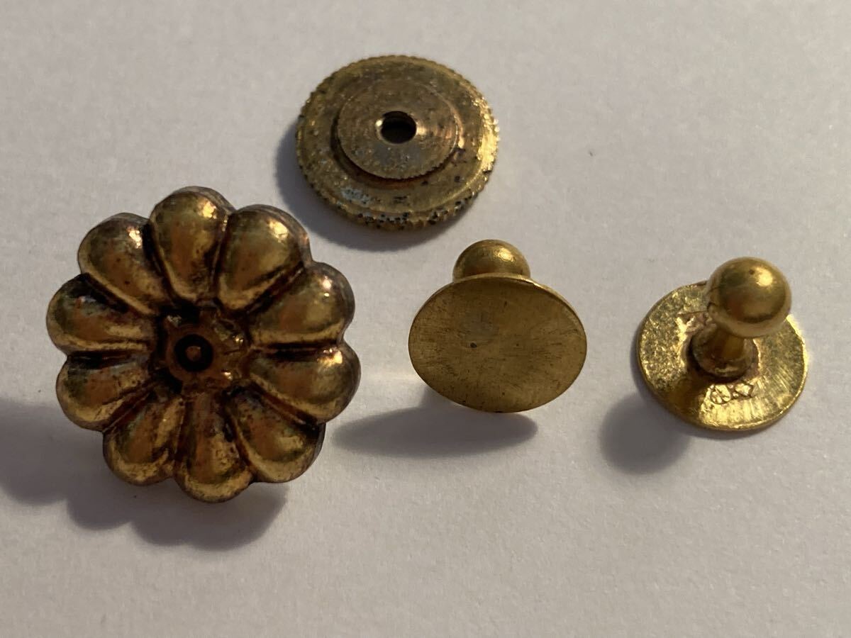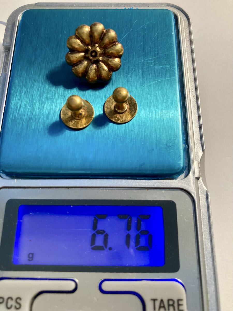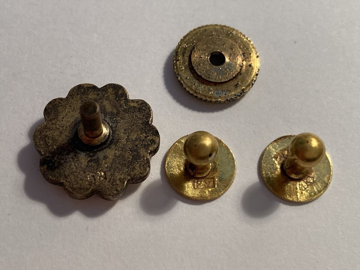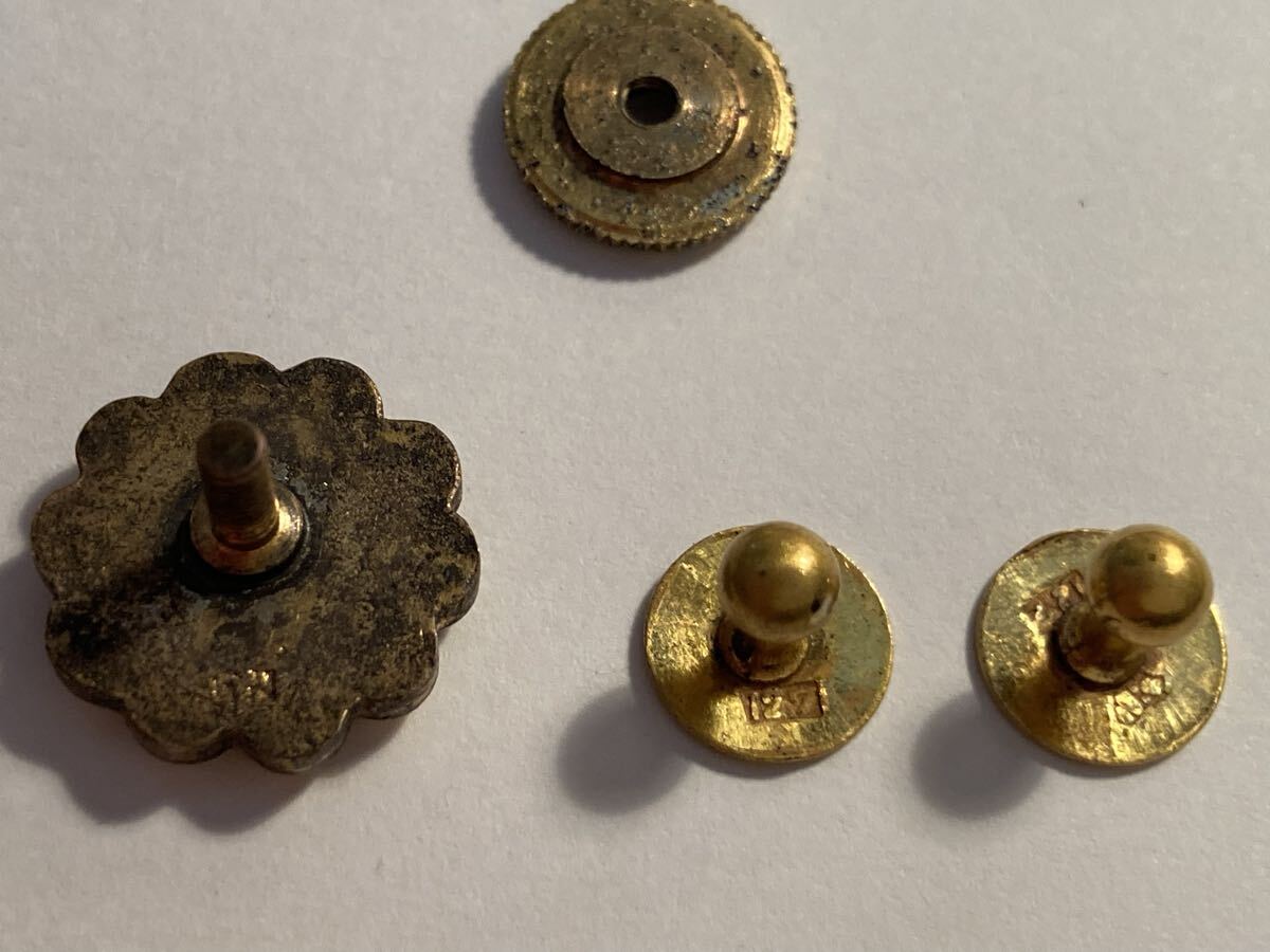 金色のピンバッジとカフスボタン、刻印は画像の通り。微細な傷などがあります。