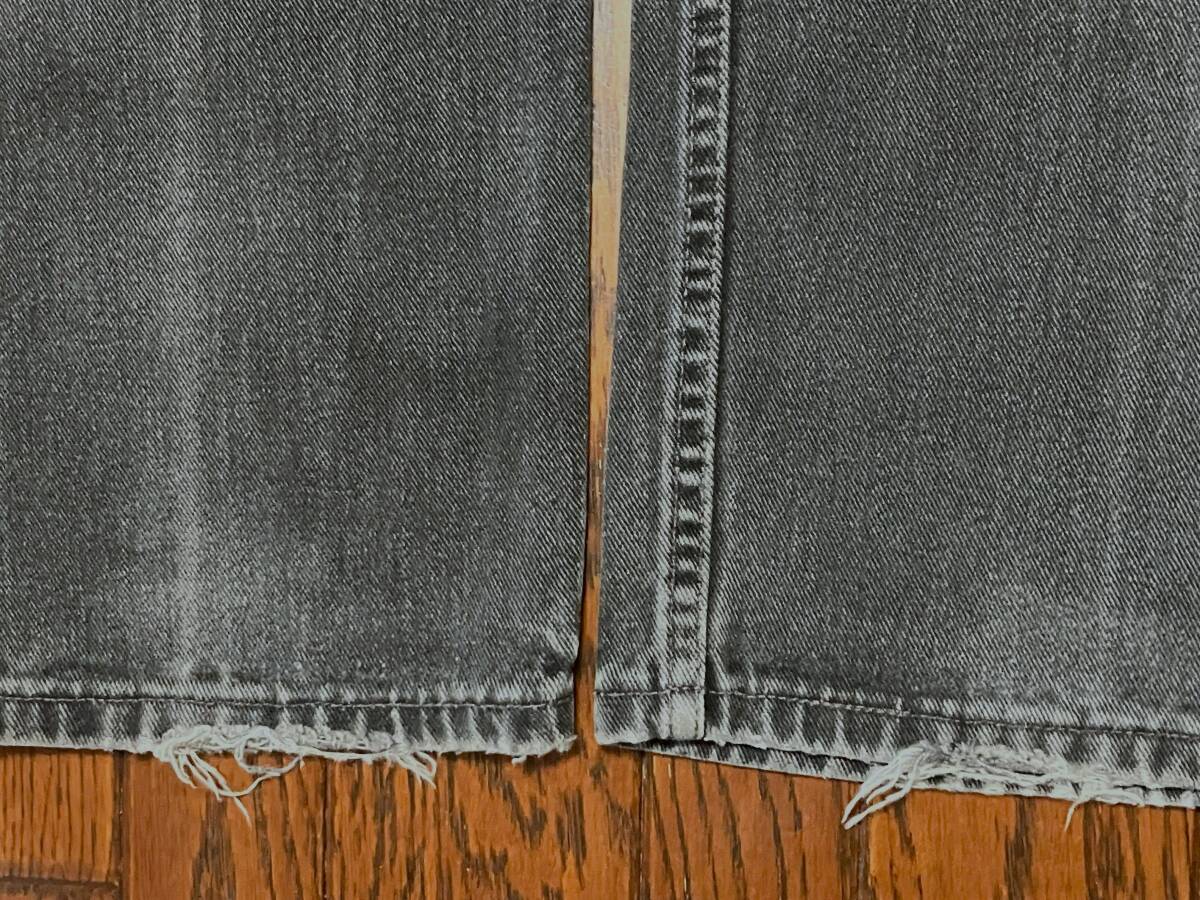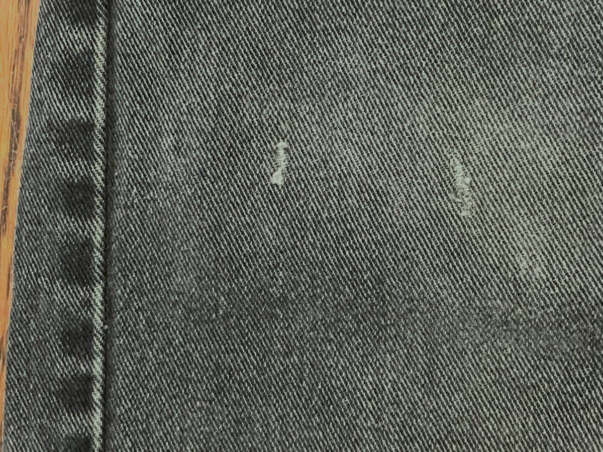 状態は腿や膝に汚れ、ポケット縁に解れ、コインポケットに擦れ、右腿に2つ小穴、裾に解れ、薄い汚れ、背面裾に解れがございます。