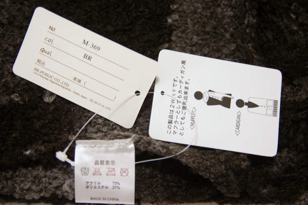 主に百貨店や専門店で取扱っている高級感あふれる2WAYカーディガン風グラデーションマフラーです。なお、一点一点の商品を大切に袋入りの状態にて保管しておりますので多少の折りシワにつきましてはご了承下さいませ。