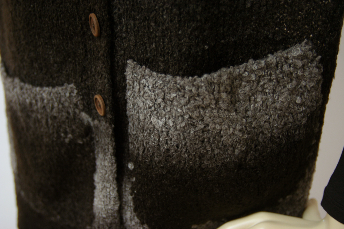 ・前で留める際の三連ボタンと、ポケットが左右に一つずつ付いています。