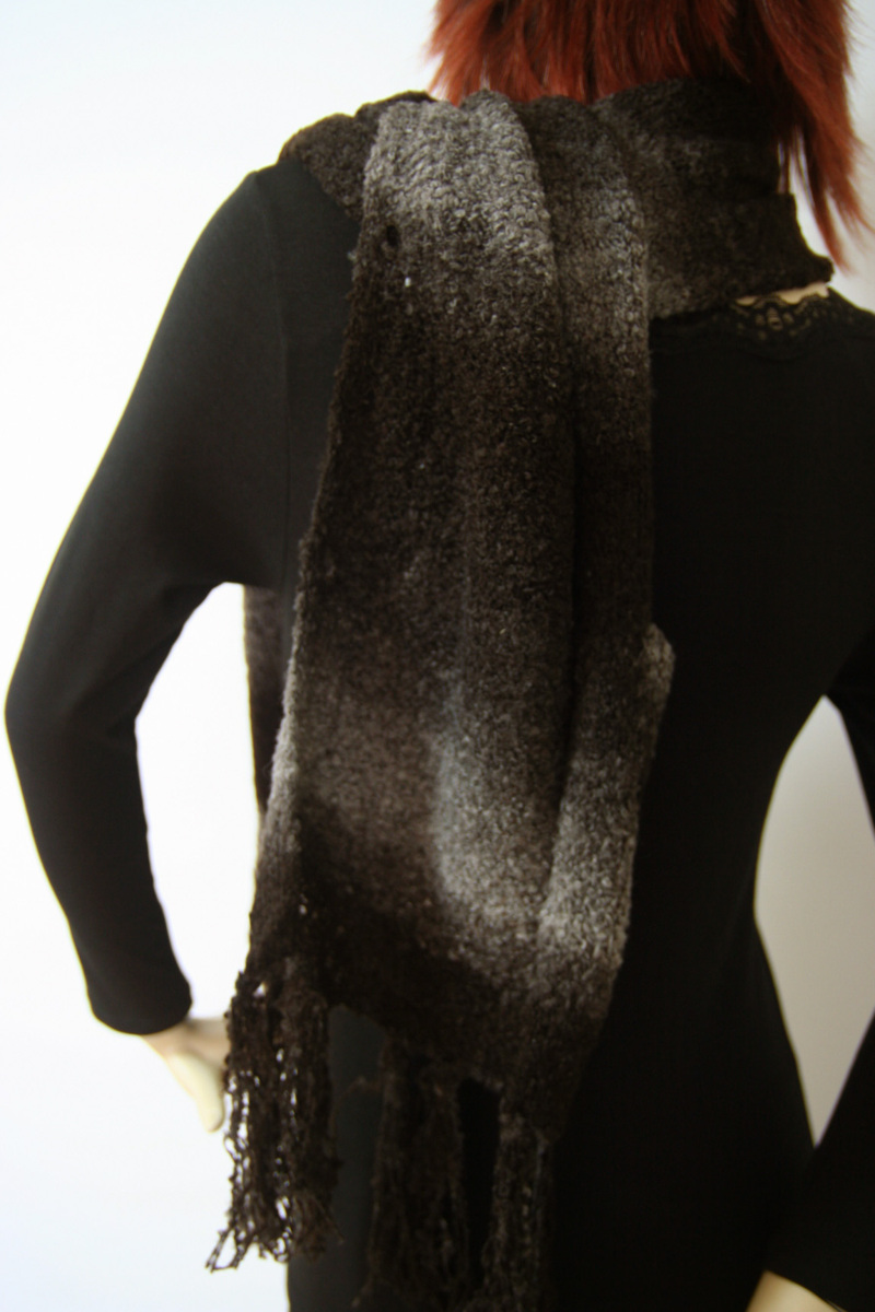 ・画像にてご覧いただけるように、①マフラーとしても②カーディガン風としてもお使いいただける、2WAYグラデーションマフラーです。