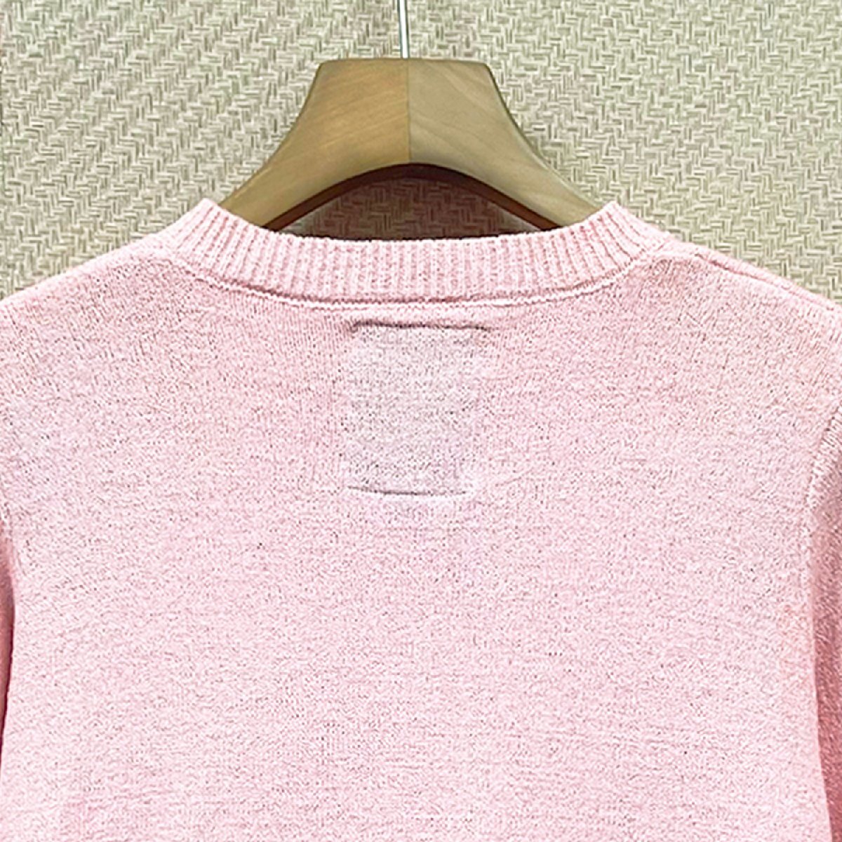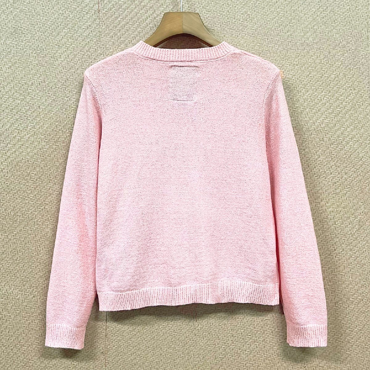 キラキラと輝くスパンコールが華やかでエレガントなデザインです。シンプルでベーシックな作りとなっており、ネック周りや袖、裾部分はリブ編みで全体の見え方にメリハリがあるコーディネートになりやすいです。ボタンを閉めてトップス風に、開けて羽織りとしても着まわせます。