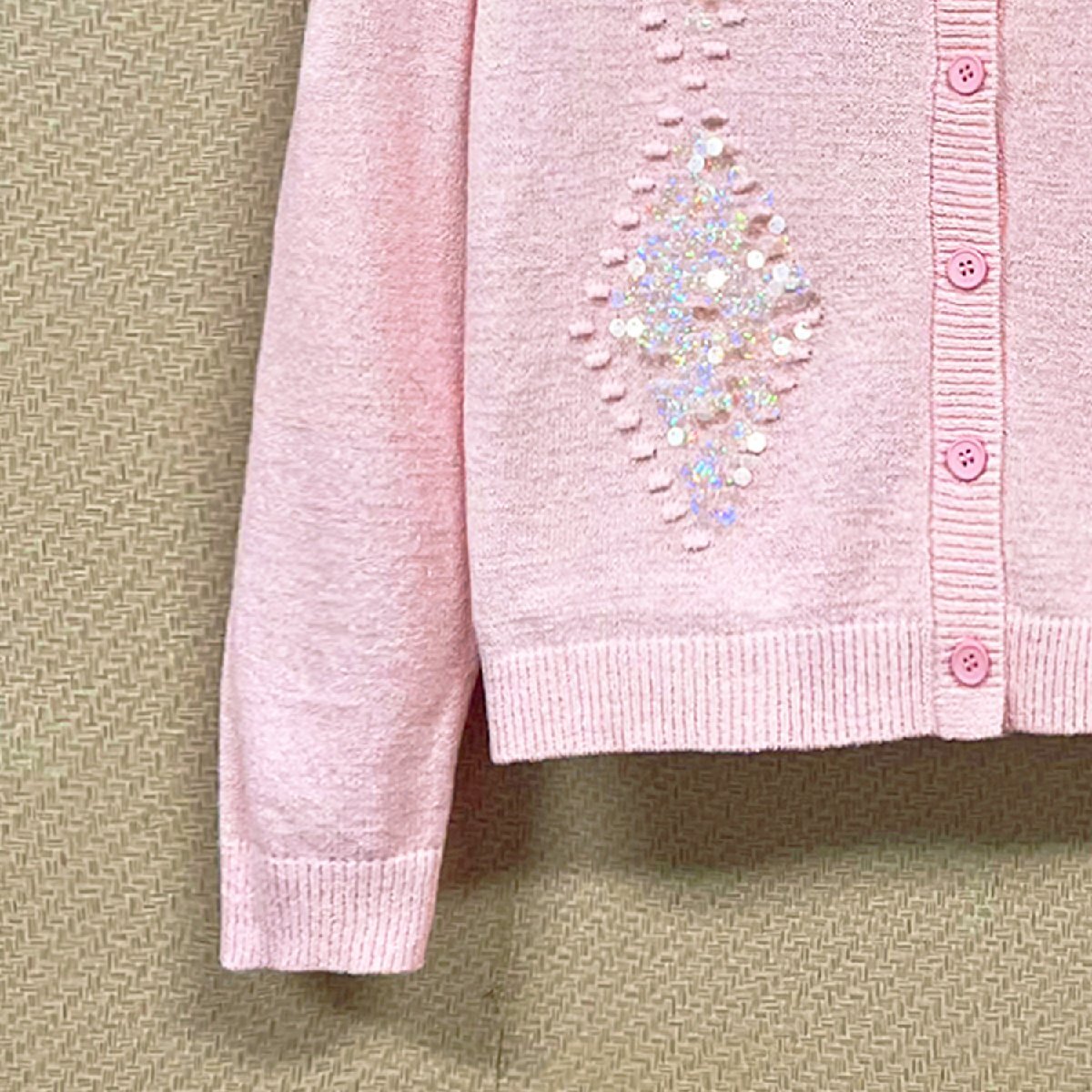 スパンコールを飾った、華やかさのあるニットカーディガンです。