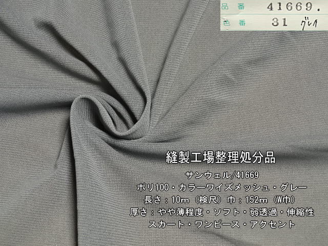| 商品説明 | 縫製工場様からの整理・処分品の激安処分です。 商品知識は御座いませんが、大量の余財を処分させて頂きます。 商品は、サンウェル/41669・ポリ100・カラーワイズメッシュ 色調は、グレーでございます。 長さは、9m(検尺)巾は、152cm(W巾)です。 画面上に長さ10mと記載されておりますが 長さ9mに訂正致します。 厚さは、やや薄程度・ソフト・弱透過・伸縮性がございます。 スカート・ワンピース・アクセントなどにいかがでしょうか。 現品限り、最終出品でございます。 この機会にお試し下さい。 |