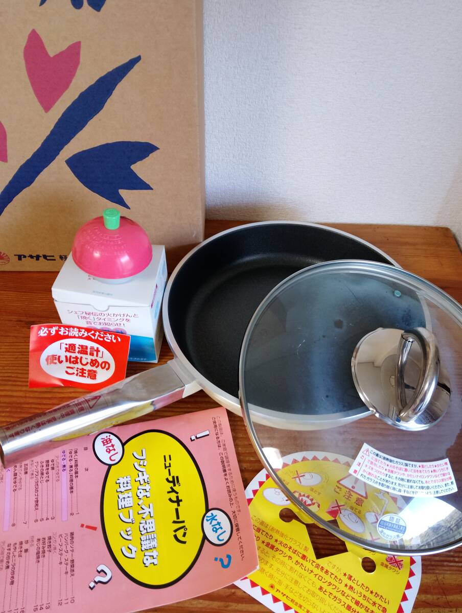 新品未使用保管品。アサヒ軽金属のニューディナーパンです。ガラス蓋/温度計/不思議な料理ブックが付属しています。IHには対応していません。気に入っていただけましたらどうぞご入札ください。