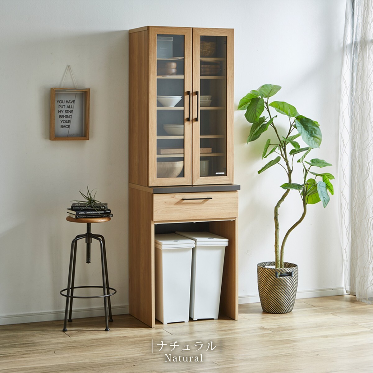 食器棚 完成品 幅60 コンパクト 引き出し ゴミ箱 おしゃれ 北欧 スリム 大容量 大川家具 木製 ナチュラル