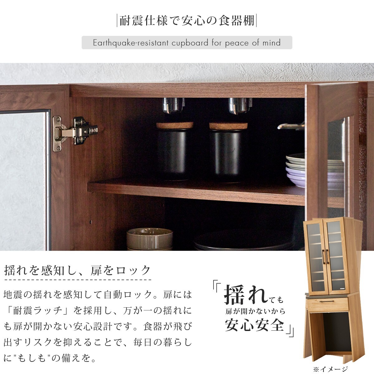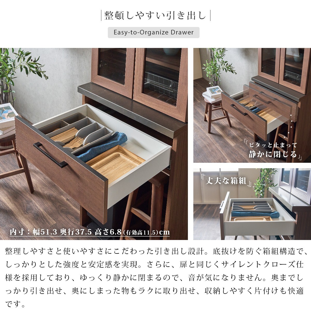 耐震機能や静かに閉まる扉・引き出し、気になるニオイを軽減する素材など、限られたキッチンスペースを快適にする工夫を詰め込みました。