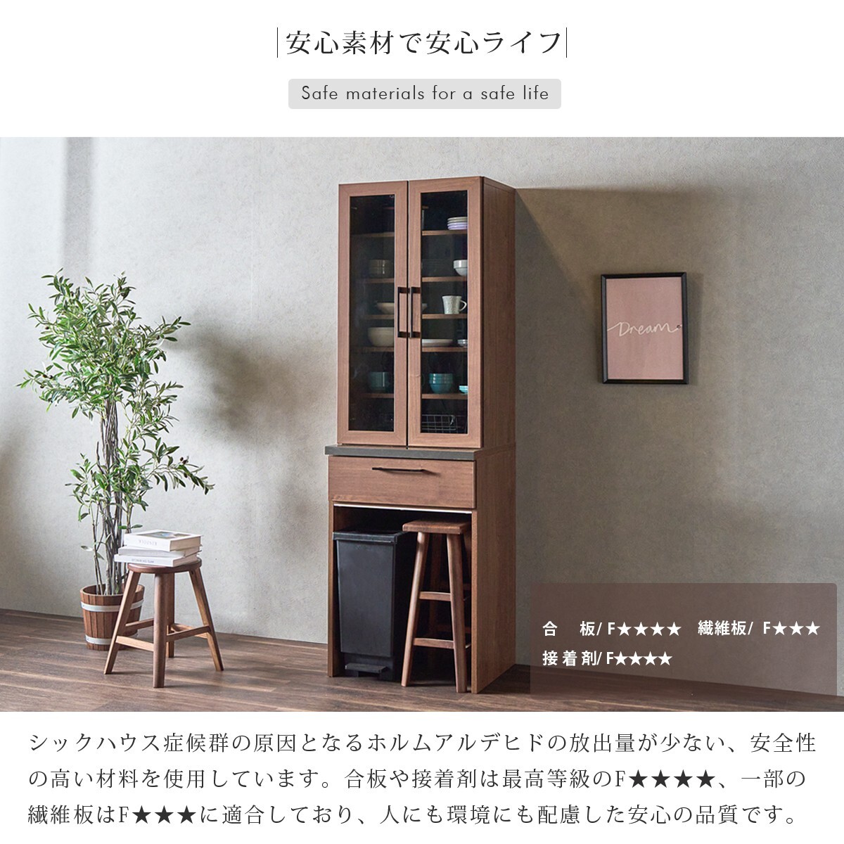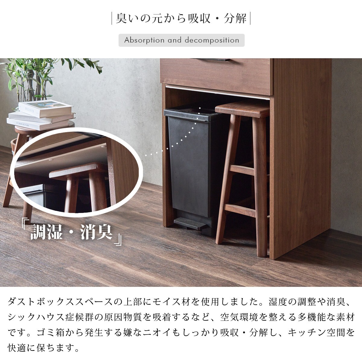 特  徴ゴミ箱の上のデッドスペースを、大容量の収納スペースとして有効活用できる日本製のダイニングボード。