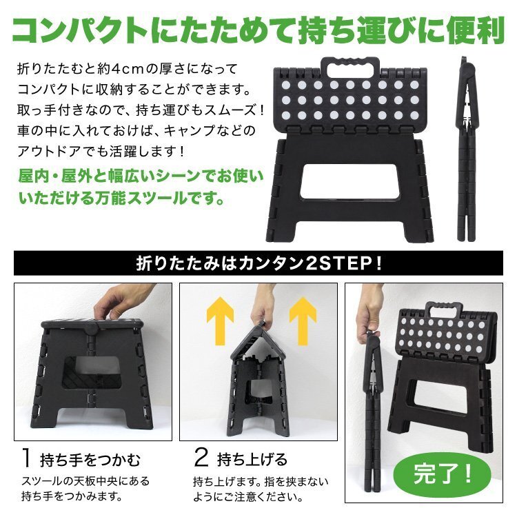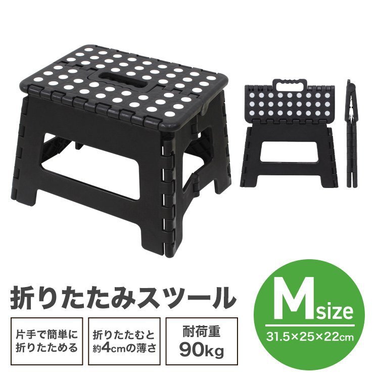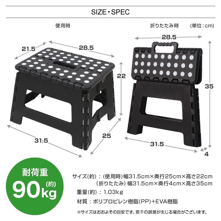 踏み台や折りたたみの椅子として、おうちに1台あると、とってもお役立ちのスツールです。 耐荷重は90kgまでなので、もちろん、大人の方が乗っても安心。 キッチンにて高いところのものを取ったり、玄関にて靴をはくときにちょっと腰掛けたり、野外に持ちだしてキャンプやスポーツのときの椅子としても活用できます。 洗車をする時の踏み台として、車に常備しておくのもお勧め。 用途はまだまだたくさんありそう、あなたの生活スタイルにあわせて、スツールをご活用ください。 折りたたむとカバンのようなカタチになるので、持ち運びもラクラク。 簡単に組み立てることができるので、お子様でも簡単に折りたたむことができます。 【商品詳細】 カラー:ブラック サイズ ・使用時:(約)幅31.5cm×奥行25cm×高さ22cm ・折りたたみ時:(約)幅31.5cm×奥行4cm×高さ35cm 重量:(約)1.5kg 耐荷重:(約)90kg 素材:ポリプロピレン、EVA ※転倒やケガにつながる恐れがありますので必ず、平坦な場所でのみご使用ください。 ※折りたたみ時に各部に手を挟まないよう、十分にご注意ください。 ※商品を使用して発生した事故・トラブル・破損等につきましては一切の責任を負いかねます。 |