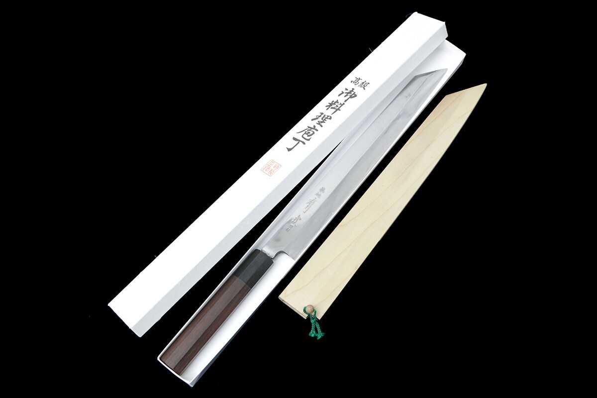 美品|有次 切付柳刃包丁 霞 尺 青二鋼 別打 黒檀柄 白鞘・箱付 KN02-B2783-2L4