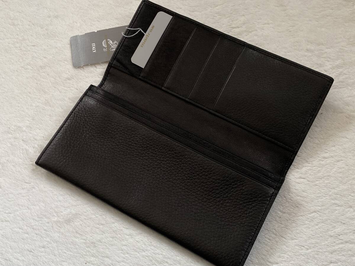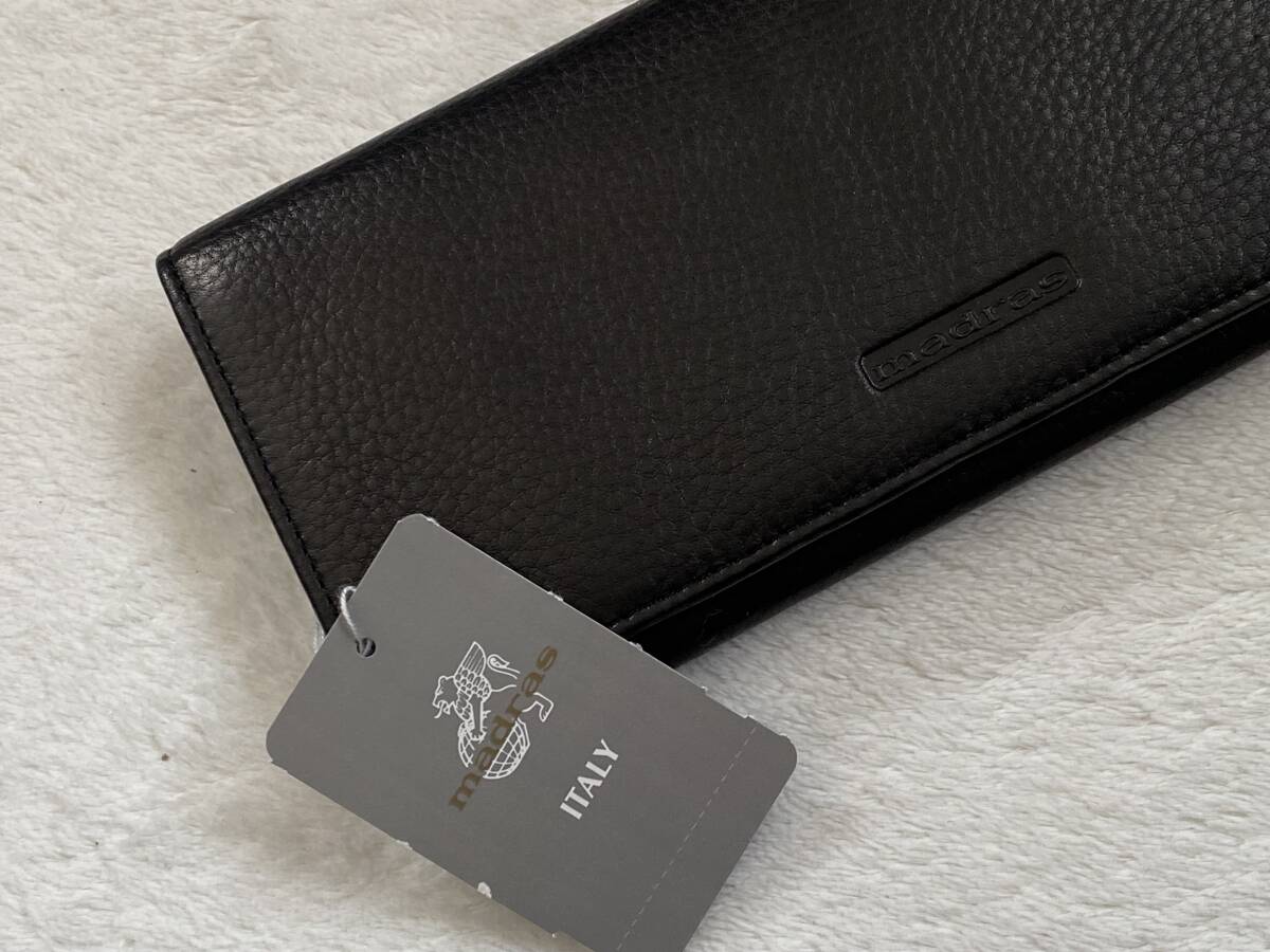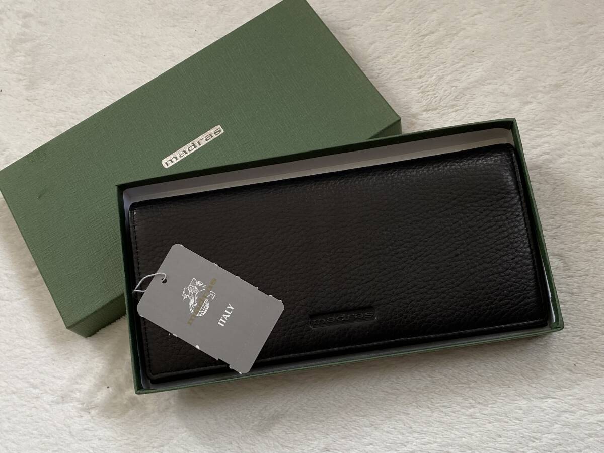 新品【madras/マドラス】日本製 紳士本革製長財布(小銭入れ付き) 内部にカード入れ×4 ファスナー付小銭入れ×1 札入れ×1、長ポケット×4 お色はブラック 手に馴染む上質な牛革を使用 正面にロゴ押し型入り ★サイズ 約8.5×18 .5cm 幅:約1.5cm ★素材 牛革 |