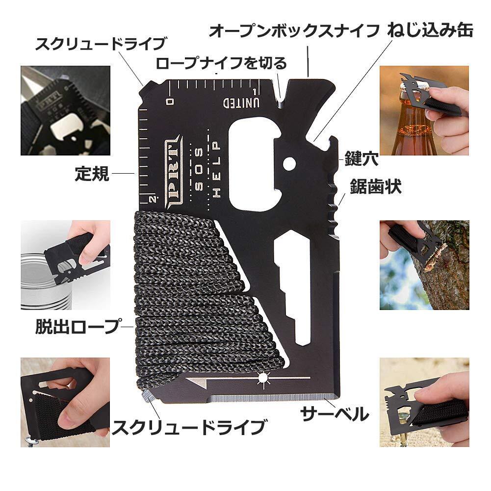 [サバイバルグッズのアップグレード]グレードアップ版軍刀カード:従来の刀カードより、大きい、小さい2つのドライバーが備え、縄刀、救命縄が追加され、もっと便利になり、機能ももっと全面的になった。サバイバルナイフ:黒のステンレスの刃と黒のアルミ合金ハンドル、錆防止の効果があり、耐用性が良い。