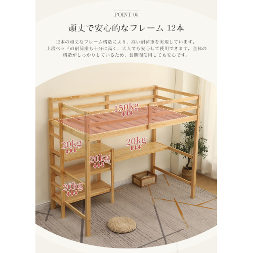 • 【38Cm高さのサイドフレーム付く】安全性を重視したデザインのロフトベッドは、頑丈な31.5cmのサイドフレームを備えています。美しいデザインとバランスを保ちながら、安心感を提供します。