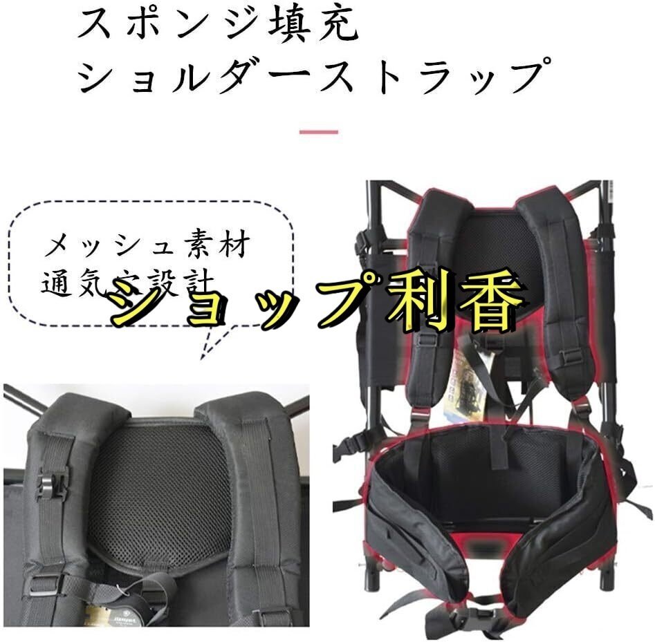アルミ製だから軽い!荷物をたくさん持てる!軽くて丈夫で錆びにくい!背面とショルダーベルトにクッションつきで体への負担を減らします。ショルダーストラップは肩幅調節が可能。
