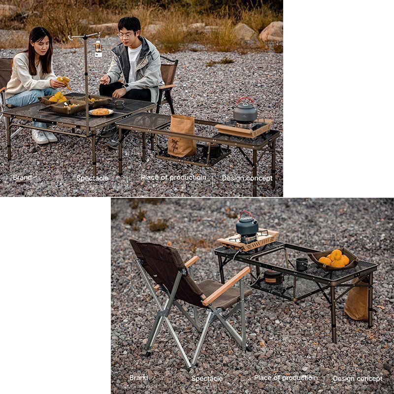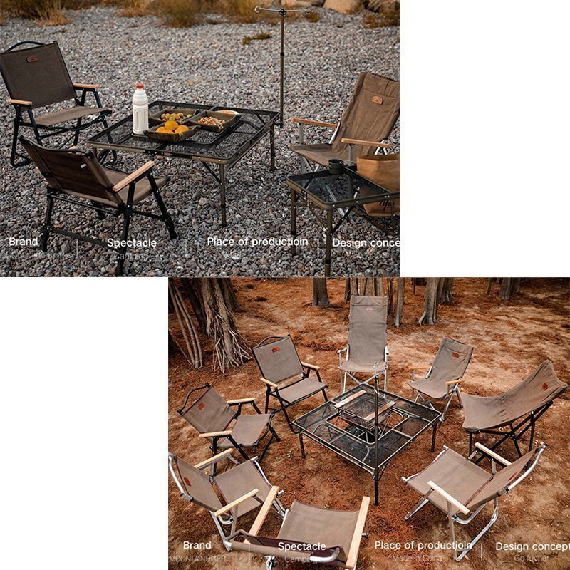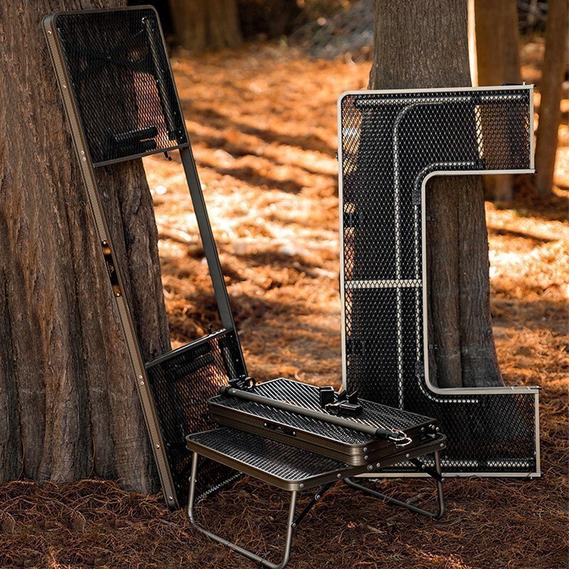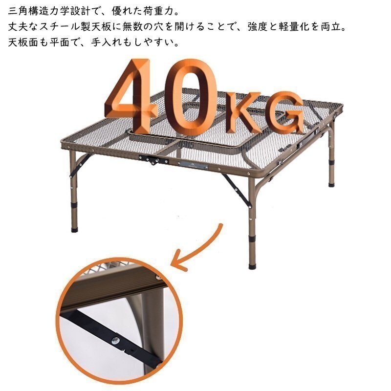 ②チェアに座りながら、たき火やBBQが楽しめるテーブル。 放熱性に優れた丈夫なスチールメッシュ天板を採用し、中央にたき火台やグリルを設置することで、チェアに座りながらたき火やBBQを楽しめる。