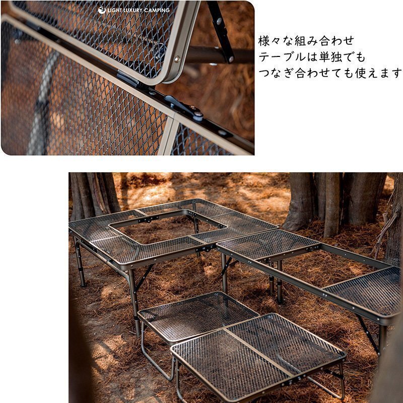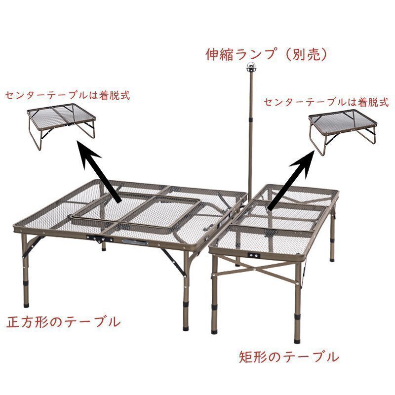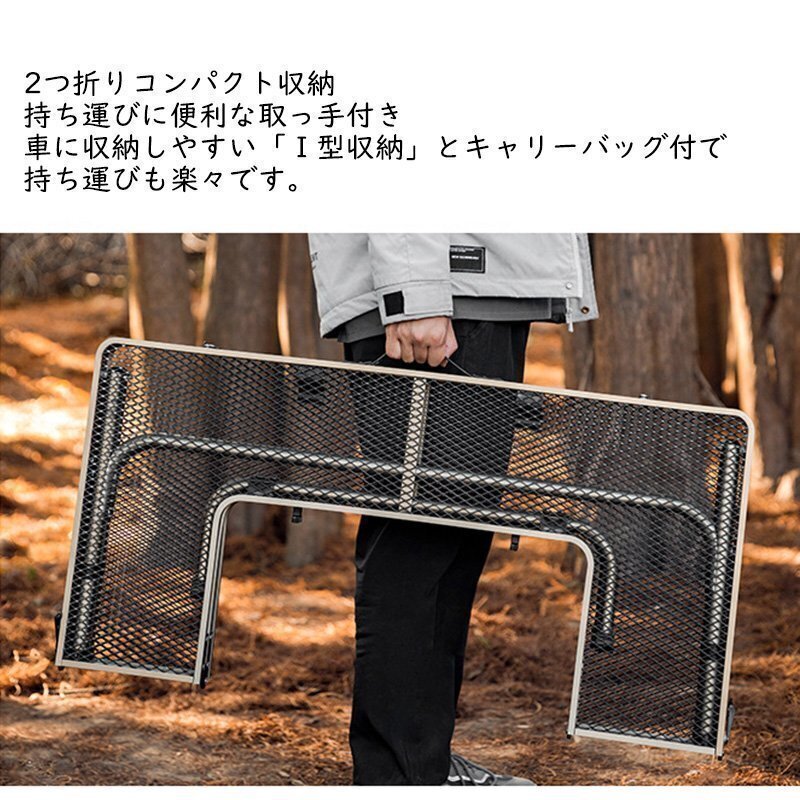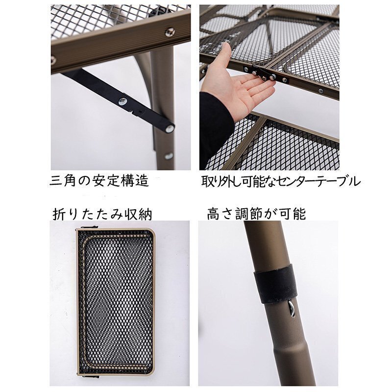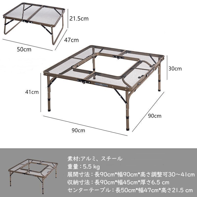 アイアン囲炉裏テーブル メッシュ 焚き火テーブル 着脱式センターテーブル付き 2つ折りコンパクト収納 調理ツール BBQアウトドア ブラック