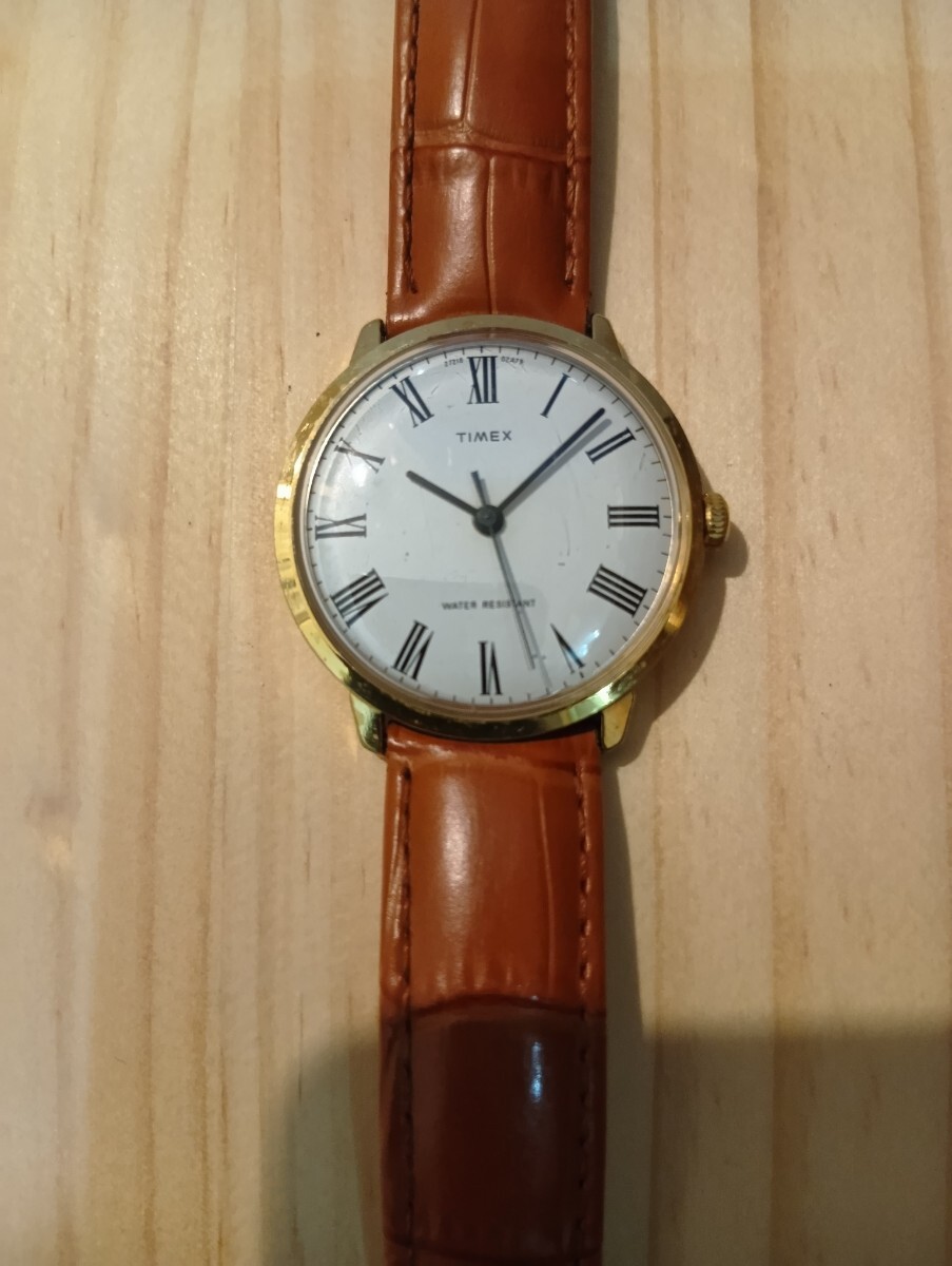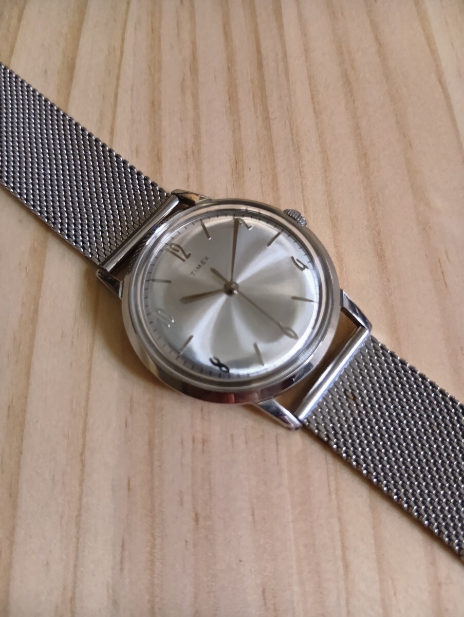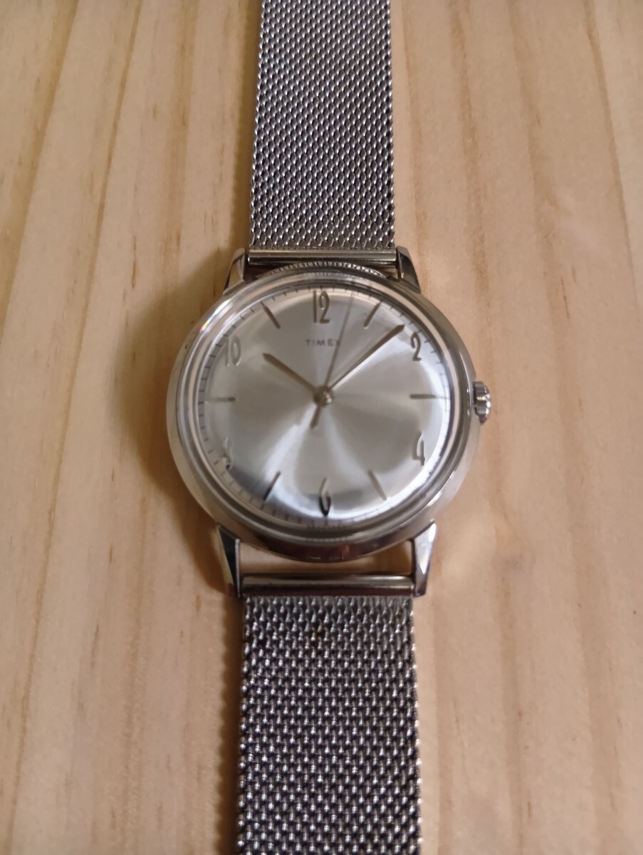 TIMEX のMARLIN 手巻の34mmの物です。ドーム型の風防や、放射状に反射するサンレイダイヤルなどがヴィンテージ感のある雰囲気です。