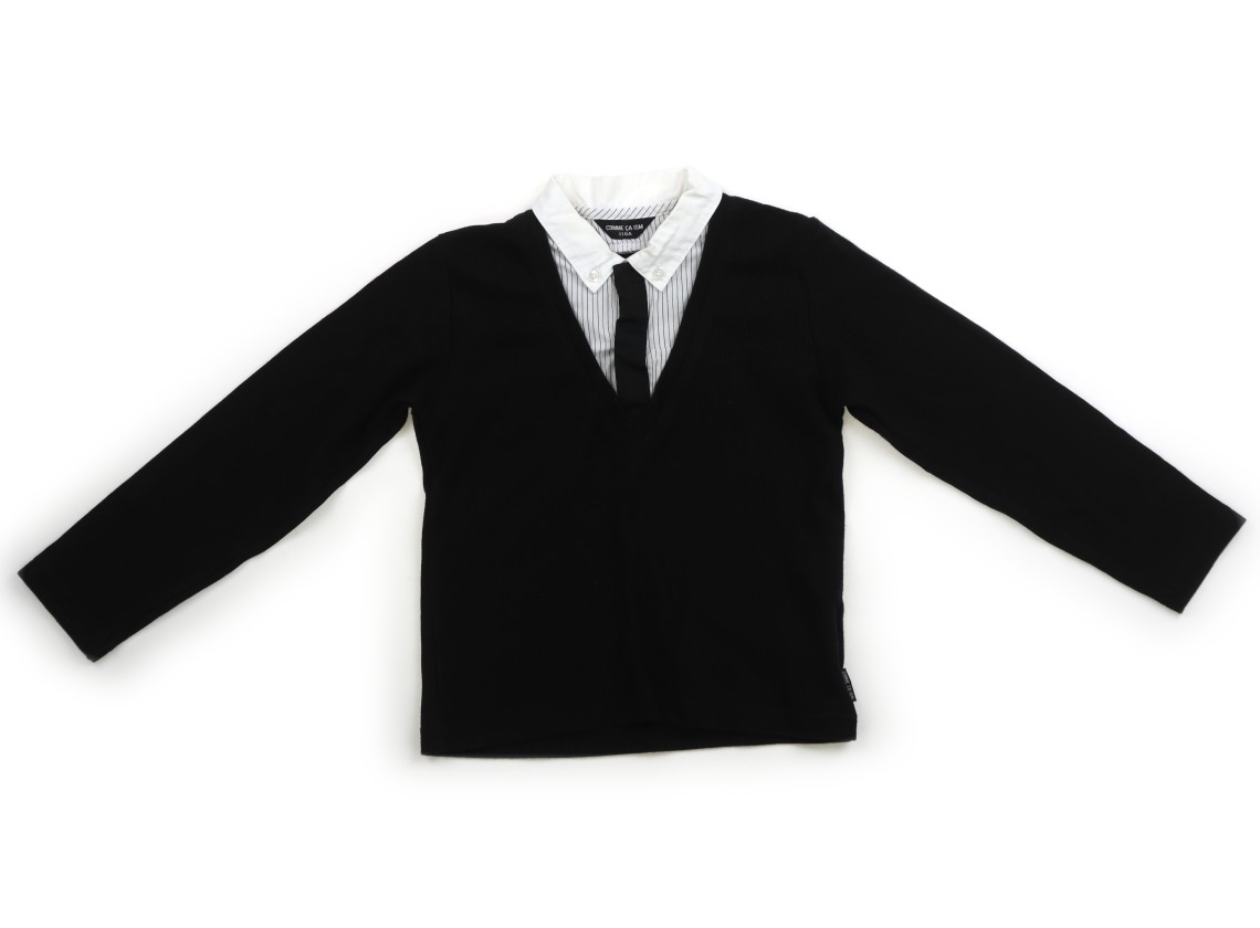 リブカットソー地とシャツ地のドッキングデザイン。首周りに薄い黄ばみ汚れあり。毛羽立ち・洗いざらし感があります。