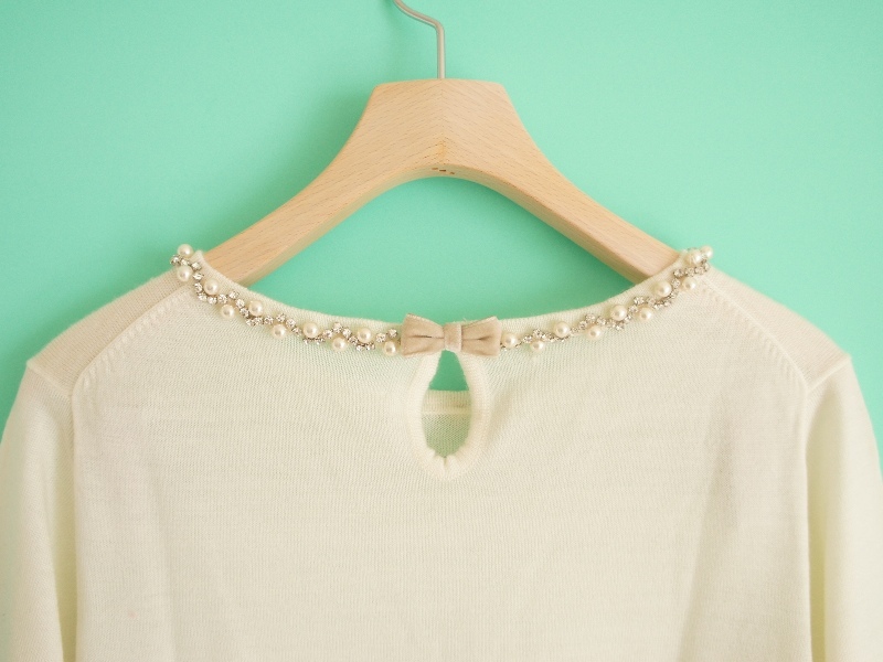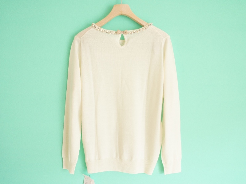 ビジューが煌めくデコラティブなネックラインが視線を惹きつける、リュクス感溢れるウール混ニットプルオーバー。バックネックの涙開き上にはリボンをちょこんとあしらい、甘いアクセントに。スカートとの相性もバッチリです。