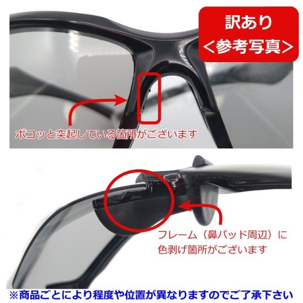 フレーム(鼻パッド付近)に色剥げ、ポコッと突起した箇所があるため、検品で はじいた訳あり商品になります。参考例写真を掲載しておりますのでご確認ください。※尚、商品ごとに程度や位置が異なりますので事前にご了承下さい。 自転車、ランニング、釣り、ドライブ、ゴルフ等、幅広く活躍します! ●偏光調光UVカットレンズ ・紫外線が当たる量に合わせてレンズの色の濃さが変わり、適度に見えやすい状態を維持します ・偏光レンズにより反射光を抑え、クリアな視界を確保 ・UV400処理で強い紫外線からあなたの目を保護します ●適度にフィットする快適な着け心地 高強度ポリカーボネート製フレーム 弾力のあるソフトシリコン製鼻パッドで鼻の当たり具合も 良好 重さはわずか約22グラム 長時間の着用でも快適です ==================== 【商品内容】 ・サングラス 1個 ・収納袋 1個 ・クロス 1枚 ※簡易包装となりますのでご了承下さい。 ==================== 【主な仕様】 ・サイズ 横幅15cm、高さ4.5cm、奥行16cm ・重さ 22g ・材質 ポリカーボネート ・UVカット UV400 ※大人用サイズ、 男女兼用 |