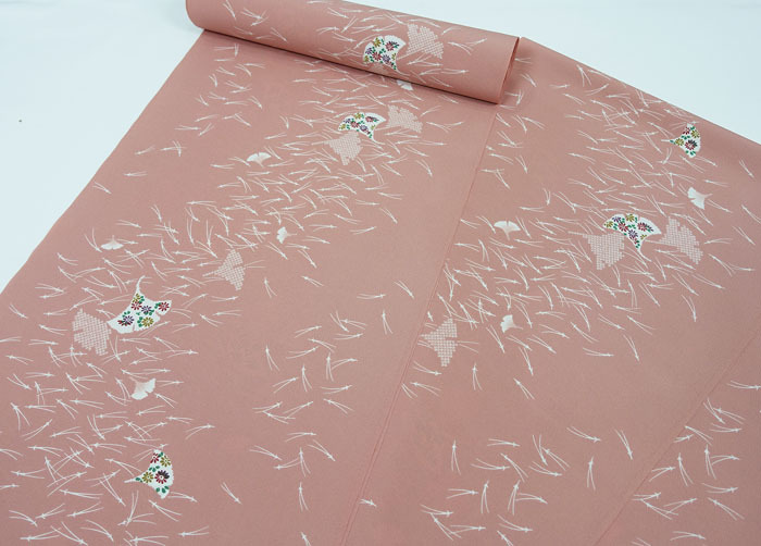 反物 未仕立て 洗えるきもの 松葉と銀杏の葉 小花と型絞り模様 ポリエステル 12101