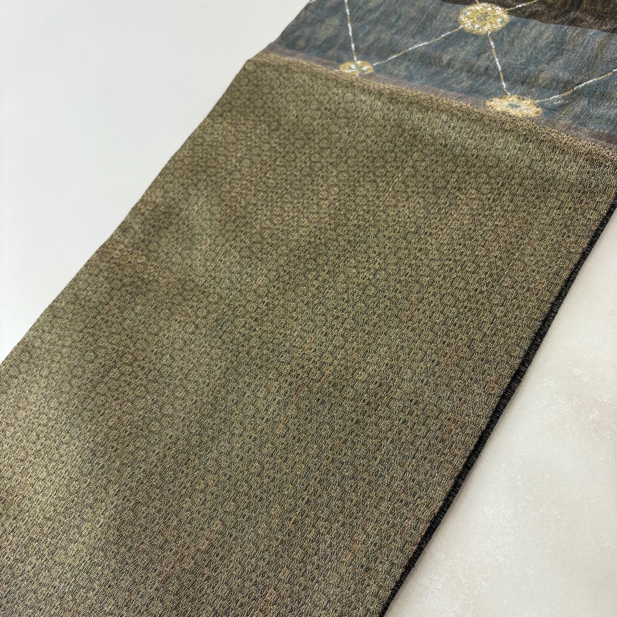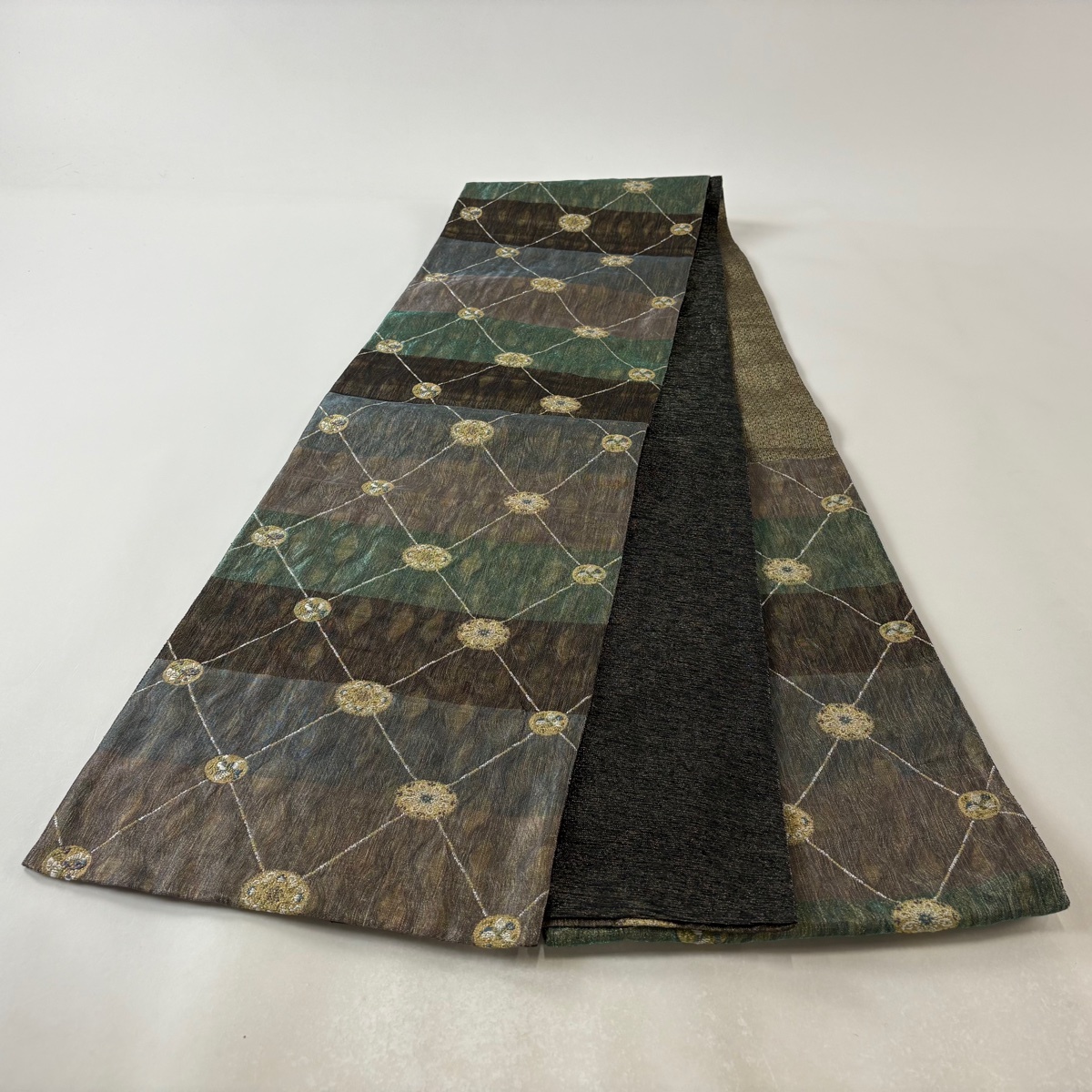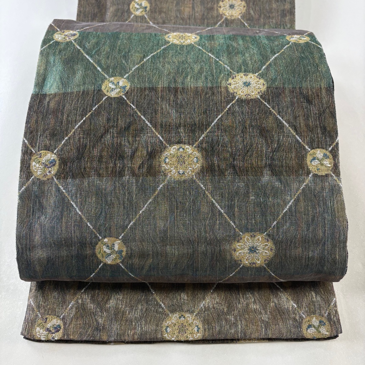 | 袋帯 美品 秀品 横段 華文 金糸 箔 茶緑色 六通 正絹 【中古】 |