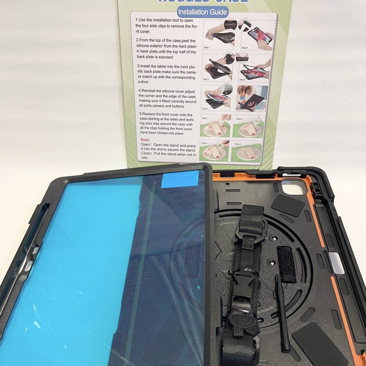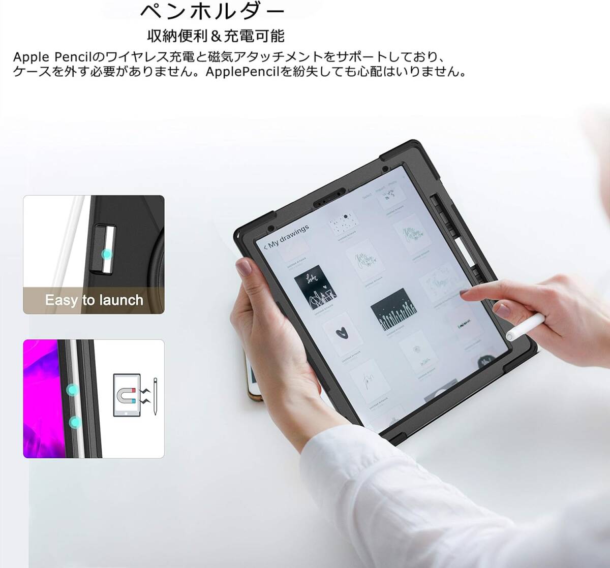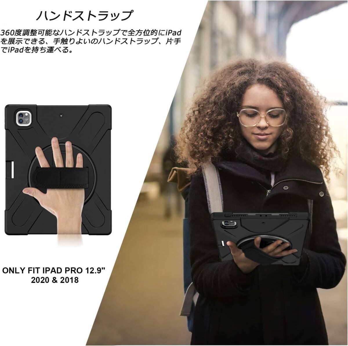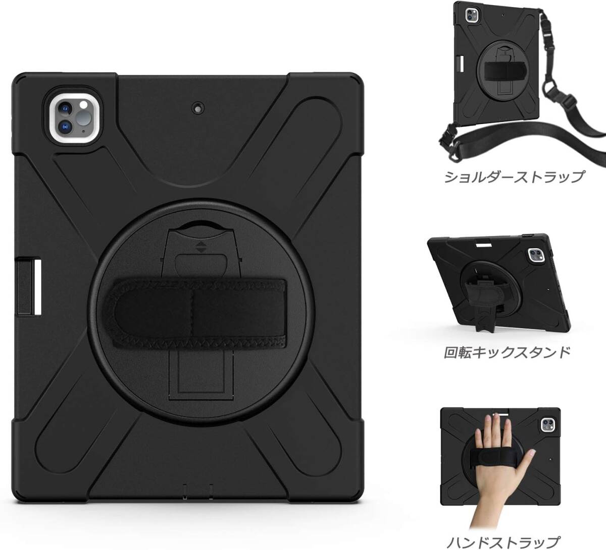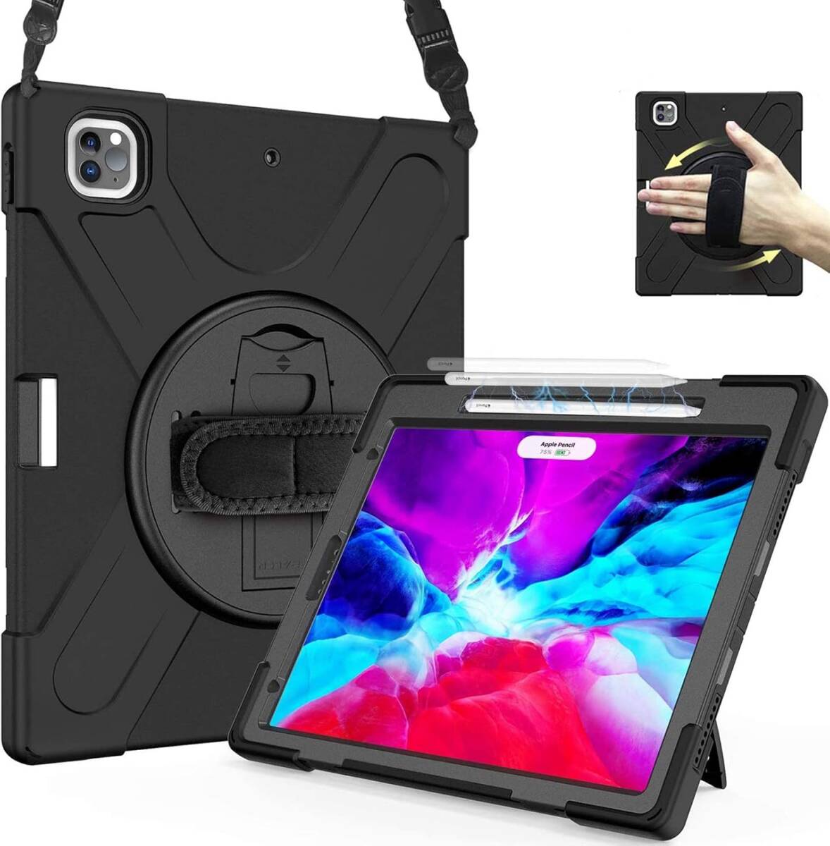 Herize iPad Pro 12.9 ケース 第6/5/4/3世代に適用(2022 2021 2020 2018)耐衝撃 iPad 12.9 シリコンケース Pencil ワイヤレス充電対応 ペンホルダー 付き 子供用 汚れにくい 防塵 ハンドホルダー&360°回転可能なスタンド&ショルダー ストラップ付き 工事用 ハードカバー,ブラック