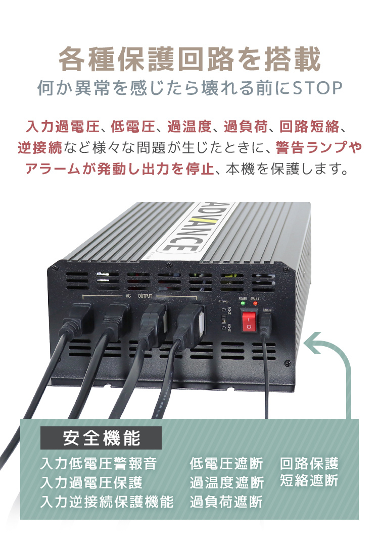 | バッテリーの直流12Vを交流100Vに変換! コンセント4個付で同時に4台の電化製品が使用可能! アウトドアはもちろん、緊急時や災害時などにも大活躍! ■商品コード:C05A ■商品仕様 寸法:415mm(L)×220mm(W)×80mm(H) AC100Vコンセント ×4 入力電圧:DC12V 出力電圧:AC100V 定格出力:2000w 最大出力:4000w 出力周波数:スイッチで50Hz/60Hz 変換可能 出力波形:矩形波(疑似正弦波) ケース:アルミ製 ■商品機能 回路保護 入力低電圧警報音 低電圧遮断 過温度遮断 過負荷遮断 短絡遮断 入力過電圧保護 入力逆接続保護機能 ■内容 インバーター本体 ×1 電源コード ×4 ■注意事項 ・電圧(12V/24V)はお間違いのないようご確認お願いいたします。 ・商品は、モニターによって色合いが異なって見える場合があります。 ・仕様・デザインは改良のため予告なく変更することがあります。 ■保障期間 7日間 ※商品到着後7日以内の初期不良・破損のみご対応させていただきます。 【新品未使用品です】 |