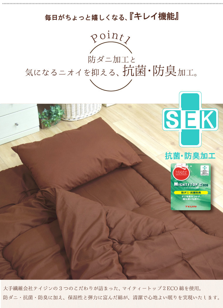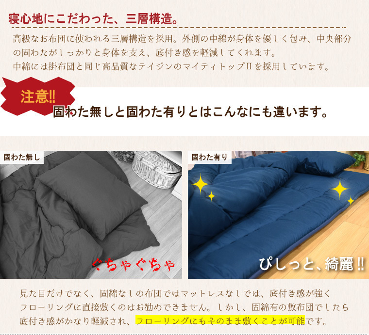 | ■仕様 | ・表の生地はやわらかなピーチスキン。カバーの着脱もスムーズです。 ・中材には防ダニ・抗菌防臭効果加工を施したTEIJINの綿を使用 ・中綿たっぷりでふかふかな寝心地。睡眠時間をより充実させます。 |