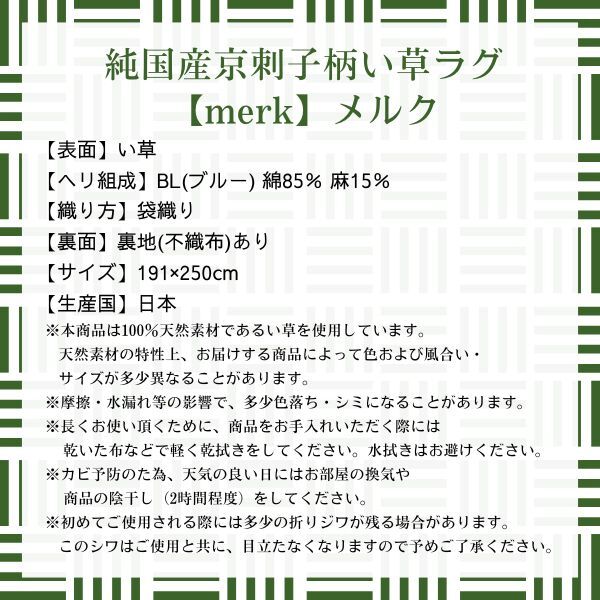 ![]() 純国産京刺子柄い草ラグ merk メルク 不織布あり 191×250cm ブルー ![]() 配送について 納期:入金確認後4営業日内(土日祝除く)に発送いたします。 ※お支払いは、代引き不可となります。 ※お届けは玄関渡しです。他の商品と同梱はできません。 ※北海道・沖縄県へのお届けは送料が発生します。 離島は配送不可ですので、予めご了承ください。 離島について:本州・本島などと橋でつながっている場合にも該当致します。 その他一部地域についてお届けができかねる場合があります。 お届け地域についてご不明な点は、ご注文前に質問欄よりお問い合せくださいませ。 内容によりましては、返答にお時間を要する場合がございます。 在庫状況について ・在庫状況は日々変動しており、お支払いのタイミングによっては メーカー在庫が欠品となる場合がございます。 ・生産状況や同時注文等により、欠品となる場合もございます。 ・在庫切れの場合はキャンセルとしてお受けいたします。 ・最新の在庫状況のご確認は、質問欄よりお問い合せくださいませ。 ご注意ください ・土日祝はお休みさせていただきます。 ・初期不良の場合はお届け後1週間以内に限り返品交換対応可能です。 ・到着後、破損不良等の有無をお確かめ下さい。 ・返品・交換は、配送時の梱包のまま使用いただくようお願いします。 なお梱包材が無い場合でのお引取りはできませんのでご注意下さい。 ・お客様都合によるイメージ違い、サイズ間違い等の事由では、 交換・返品・キャンセル等お受けできません。 ご不明点などありましたらお気軽にお問い合せください。 すぐにお返事できない場合もございますので、余裕をもってのお問い合せをお願い致します。 b040701450bl 100022624 |