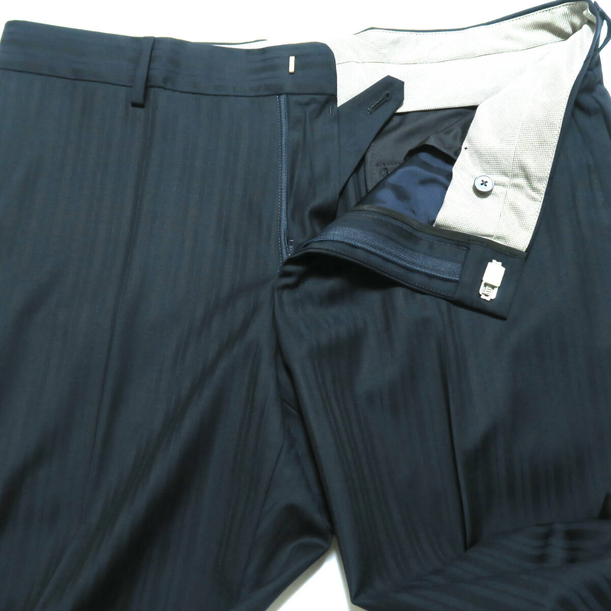■レギュラーシルエット。程よいシェイプ感があります ■パンツの裾は少しテーパードしてスッキリしています ■ウエストをシャープに見せてくれるノータックでスタイリッシュにきれいなラインを表現してくれます ■ウエストが1.5センチほど伸縮するアジャスト機能付きの前ホックを採用していますのでウエスト周りの着用感が快適です。 ■裾は丈詰め済みです。当方ではお直しは対応していませんのでお直しは落札者様がお直し店へお持ち込みください | ||