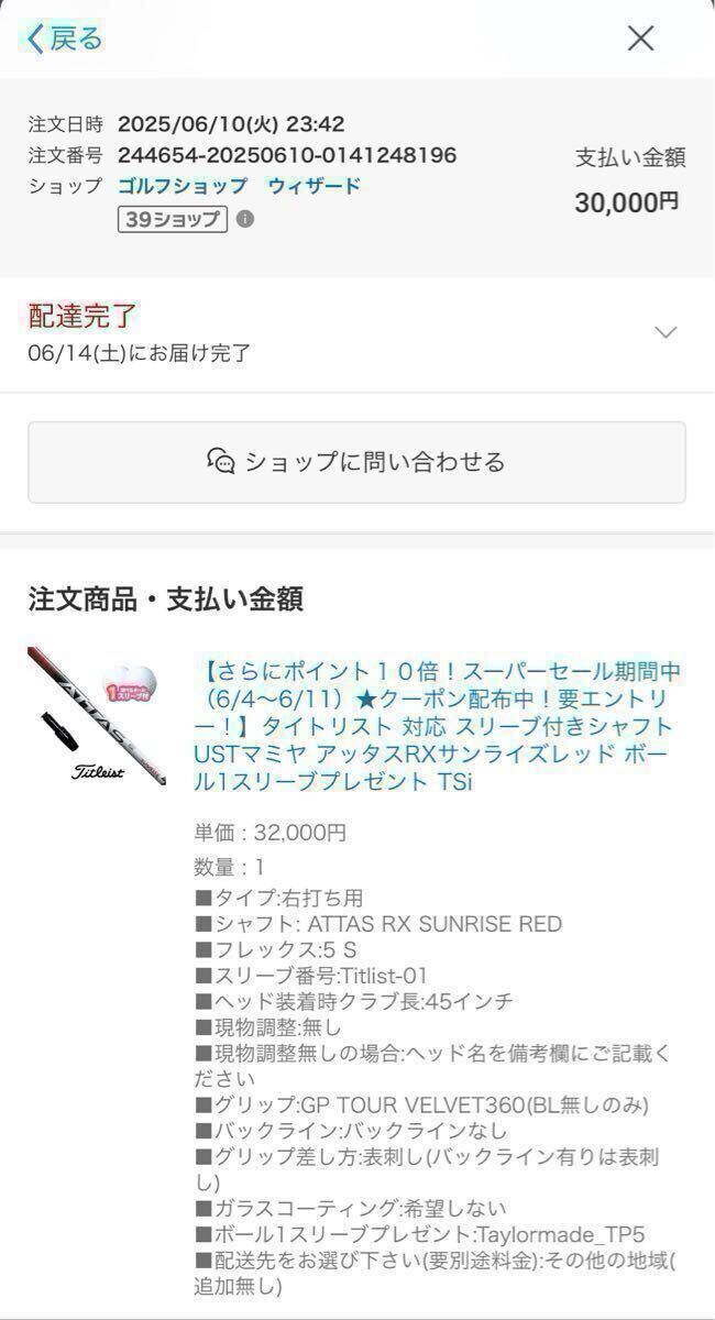 シャフトはゴルフショップウィザード楽天市場店にて45インチで2025年6月に購入しました(画像9枚目購入履歴画像)。
