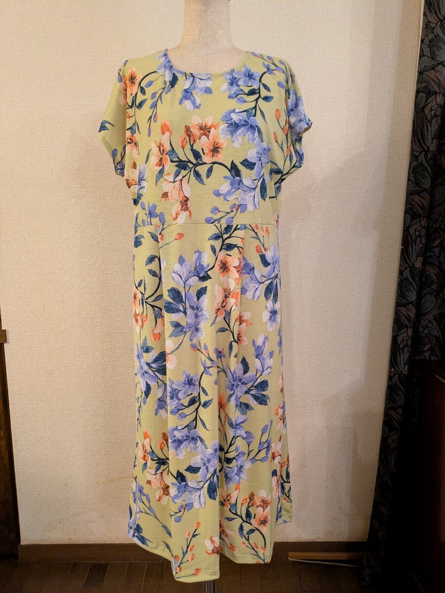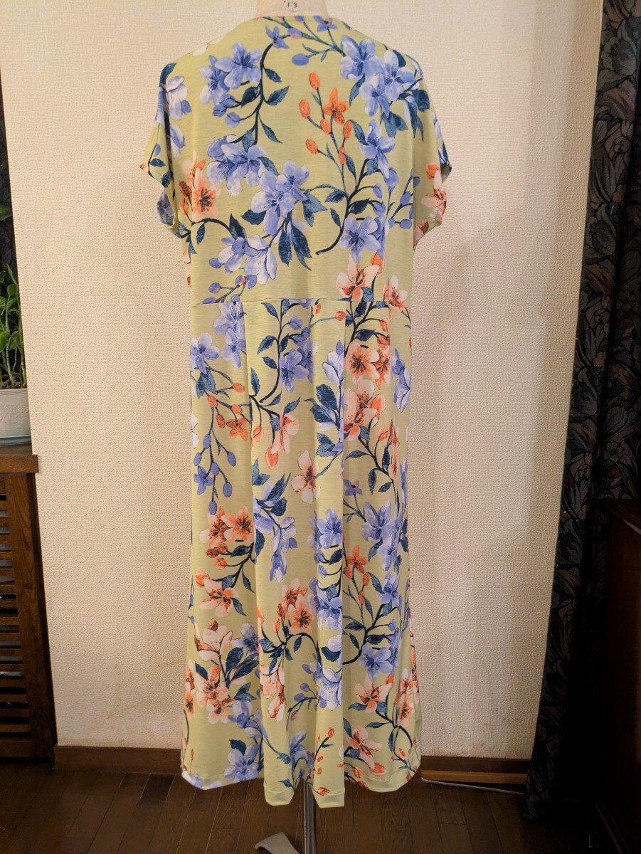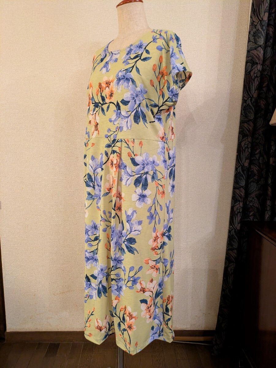 落ち着いた色調のイエローの地に、大きめな花柄プリントの、ニット生地です。